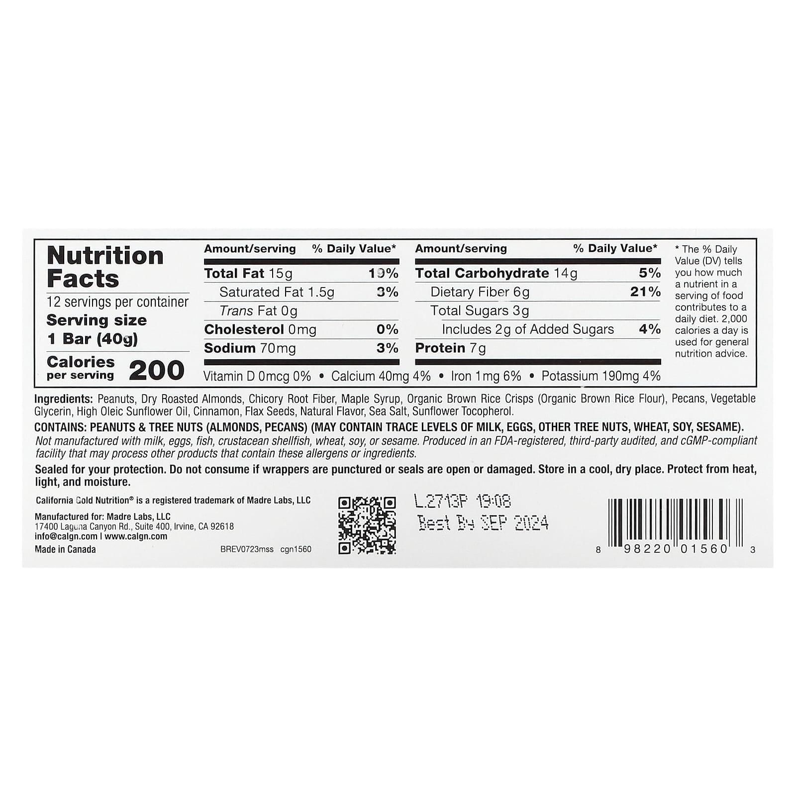 As Barras de Xarope de Bordo e Sal Marinho da California Gold Nutrition Foods são feitas com ingredientes simples, como amendoim, amêndoas torradas, sementes de linhaça, sal marinho e xarope de bordo e são naturalmente adoçadas. Cada barra é embalada individualmente, fazendo com que seja um lanche perfeito a qualquer hora e em qualquer lugar.