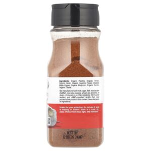 O Tempero Cajun Orgânico da California Gold Nutrition Foods contém páprica, cebola, alho, pimenta caiena, pimenta-do-reino, manjerona, cominho e tomilho orgânicos certificados. Não contém glúten, OGMs ou soja.