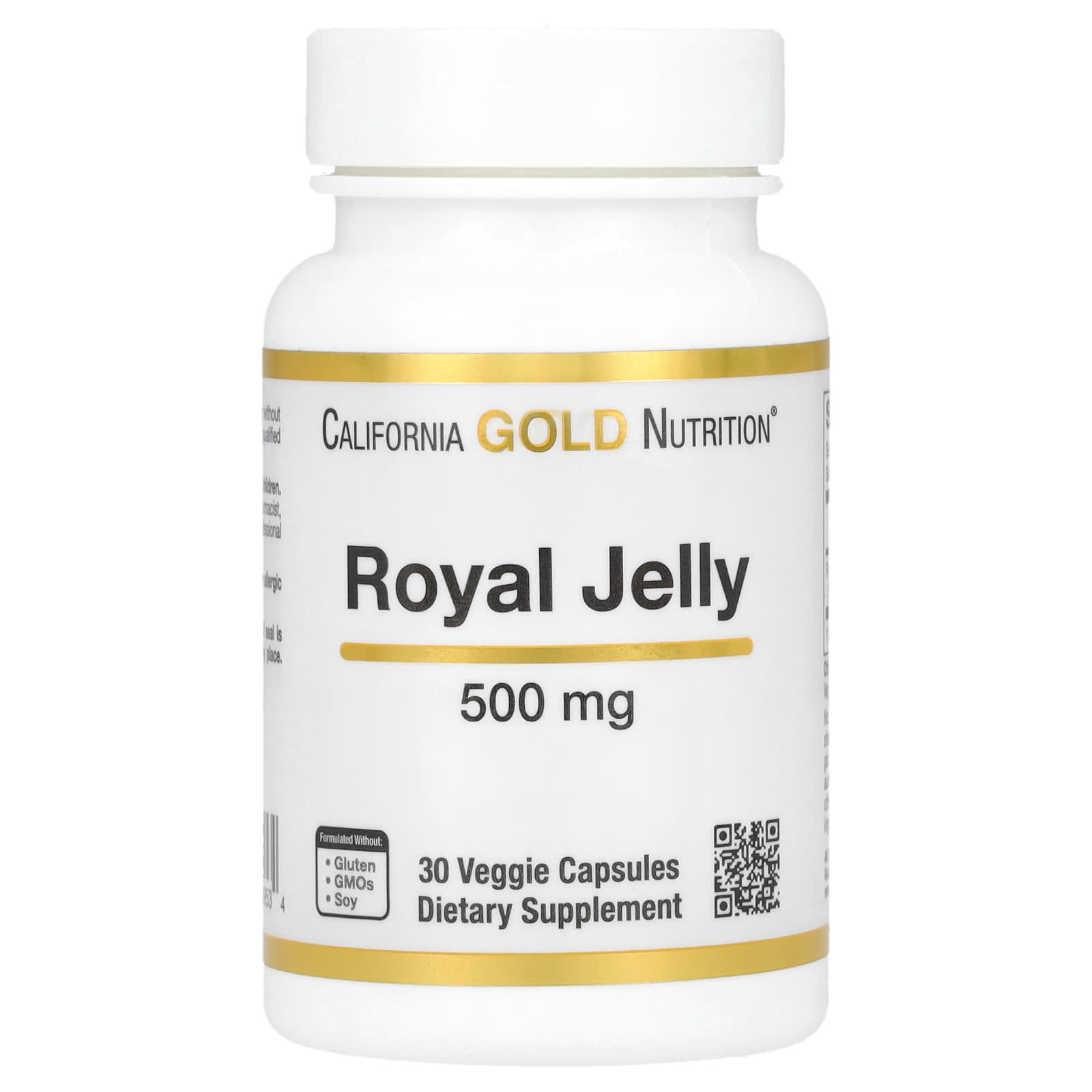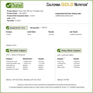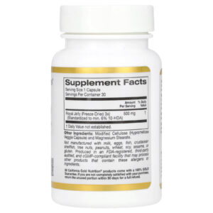 A Geleia Real da California Gold Nutrition contém um concentrado liofilizado a 3:1 de geleia real em cápsulas vegetais. Isso equivale a 1.500 mg de geleia real fresca e contém no mínimo 6% de 10-HDA. Quando tomado conforme as instruções, um frasco fornece quantidade suficiente para aproximadamente 4 meses.