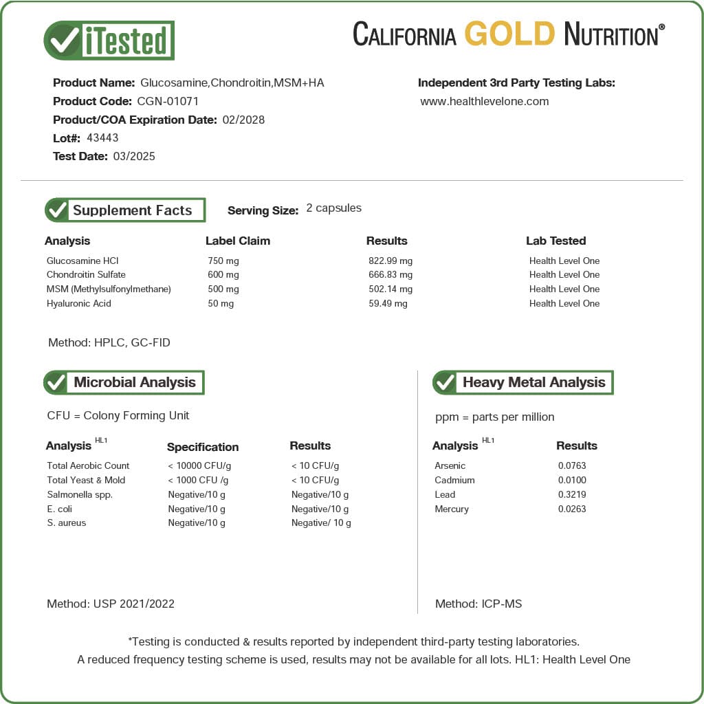 - Glicosamina, Condroitina, MSM mais Ácido Hialurônico da California Gold Nutrition®