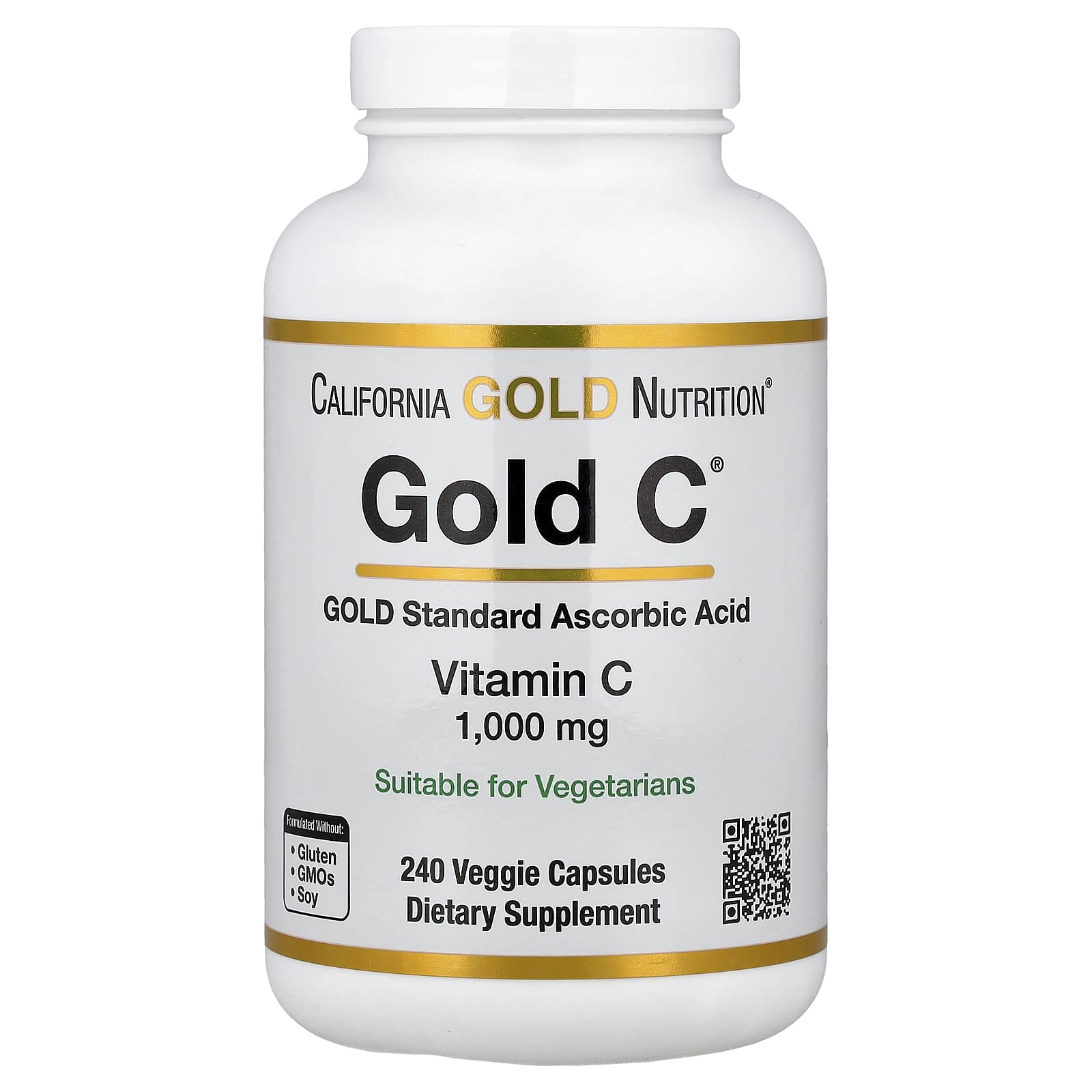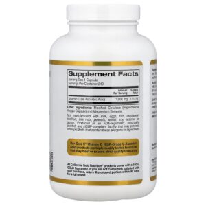 A Gold C™ da California Gold Nutrition contém vitamina C de classe USP (como ácido ascórbico) em cápsulas vegetais. Este suplemento é adequado a vegetarianos e formulado sem glúten, OGM ou soja.