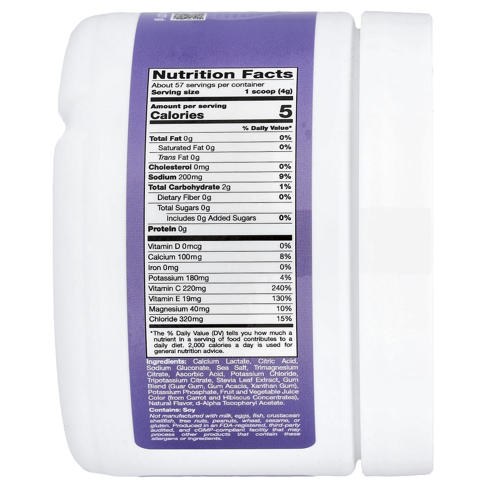 Lactato de Cálcio, Ácido Cítrico, Gliconato de Sódio, Sal Marinho, Citrato de Magnésio, Ácido Ascórbico, Cloreto de Potássio, Citrato de Potássio, Extrato da Folha de Estévia, Mistura de Gomas (Goma Guar, Goma de Acácia, Goma Xantana), Fosfato de Potássio, Corante de Suco de Frutas e Vegetais (de Concentrados de Cenoura e Hibisco), Sabor Natural, Acetato de Dextroalfatocoferol.