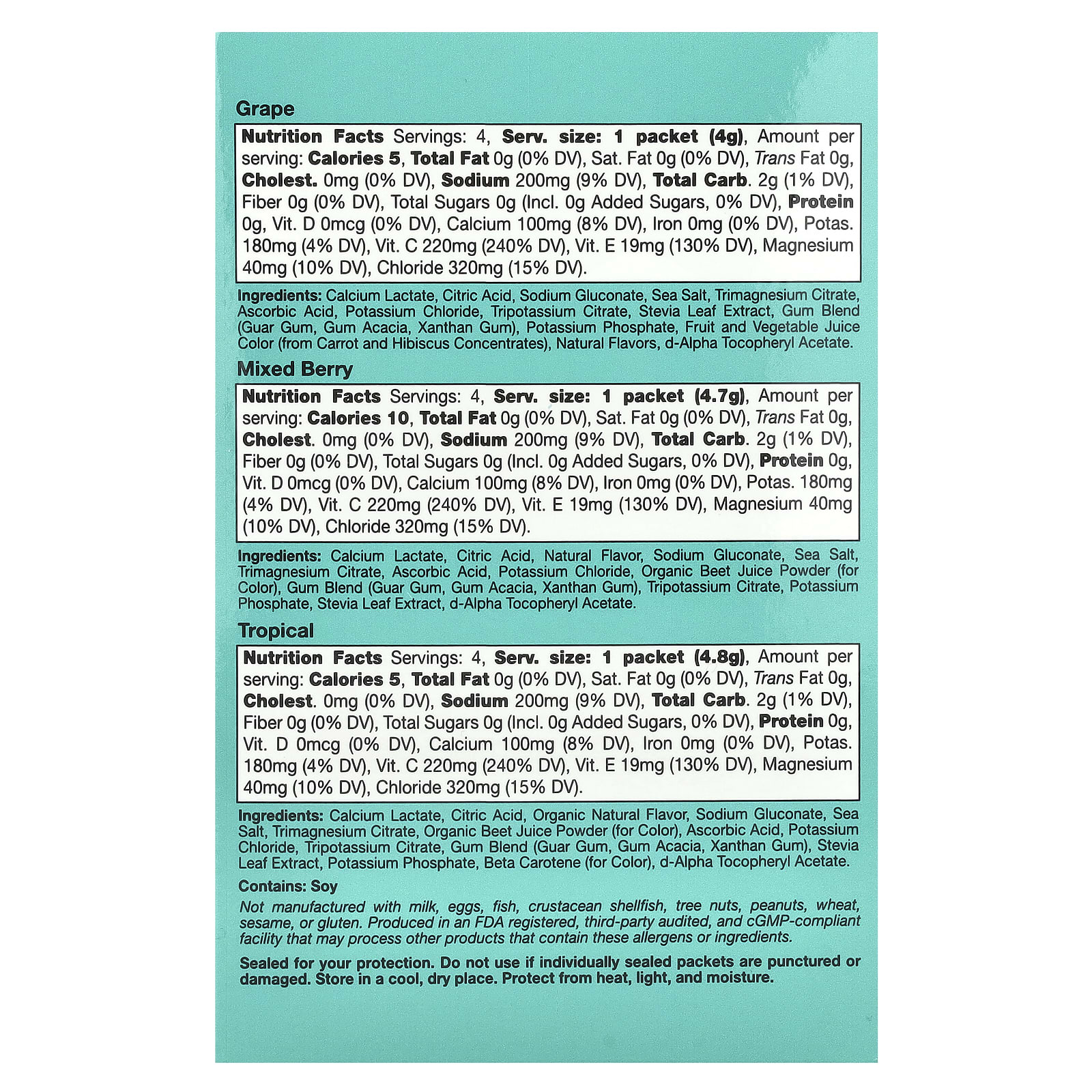 Lactato de Cálcio, Ácido Cítrico, Gliconato de Sódio, Sal Marinho, Citrato de Magnésio, Ácido Ascórbico, Cloreto de Potássio, Citrato de Potássio, Mistura de Gomas (Goma Guar, Goma de Acácia, Goma Xantana), Extrato da Folha de Estévia, Fosfato de Potássio, Suco de Frutas e Vegetais (corante), Acetato de Dextroalfatocoferol.