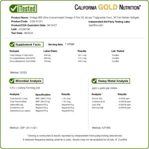 California Gold Nutrition Ômega 800 Óleo de Peixe Ômega-3 Ultra-Concentrado Forma de Triglicerídeos kd-pur® 30 Cápsulas Softgel de Gelatina de Peixe (1.000 mg por Cápsula Softgel) – California Gold Nutrition Suplementos Ômegas e Óleos de Peixe (EPA/DHA) Ômega 3 e Óleo de Peixe Ômegas kd-pur®.