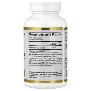 Reforce sua saúde com nosso California Gold Nutrition® Palmidrol (PEA). Esta fórmula de 600 mg por dose é composta de amida de ácidos graxos de alta qualidade projetada para promover o equilíbrio natural do seu corpo.Testamos rigorosamente a qualidade e orgulhosamente oferecemos um produto adequado para veganos.