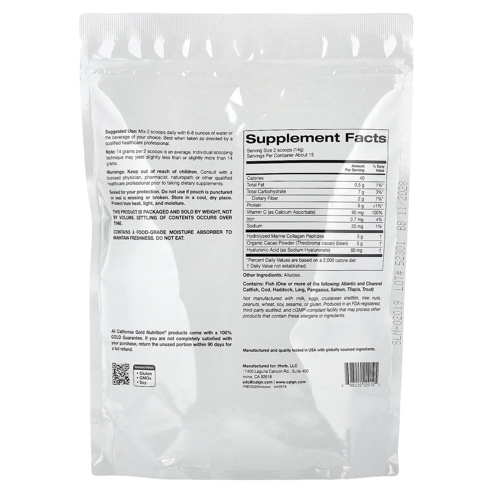 California Gold Nutrition® Peptídeos de Colágeno Marinho Hidrolisado com Cacau pode ser misturado com água ou o líquido de sua escolha para criar uma bebida saborosa e uma fonte conveniente de peptídeos de colágeno.