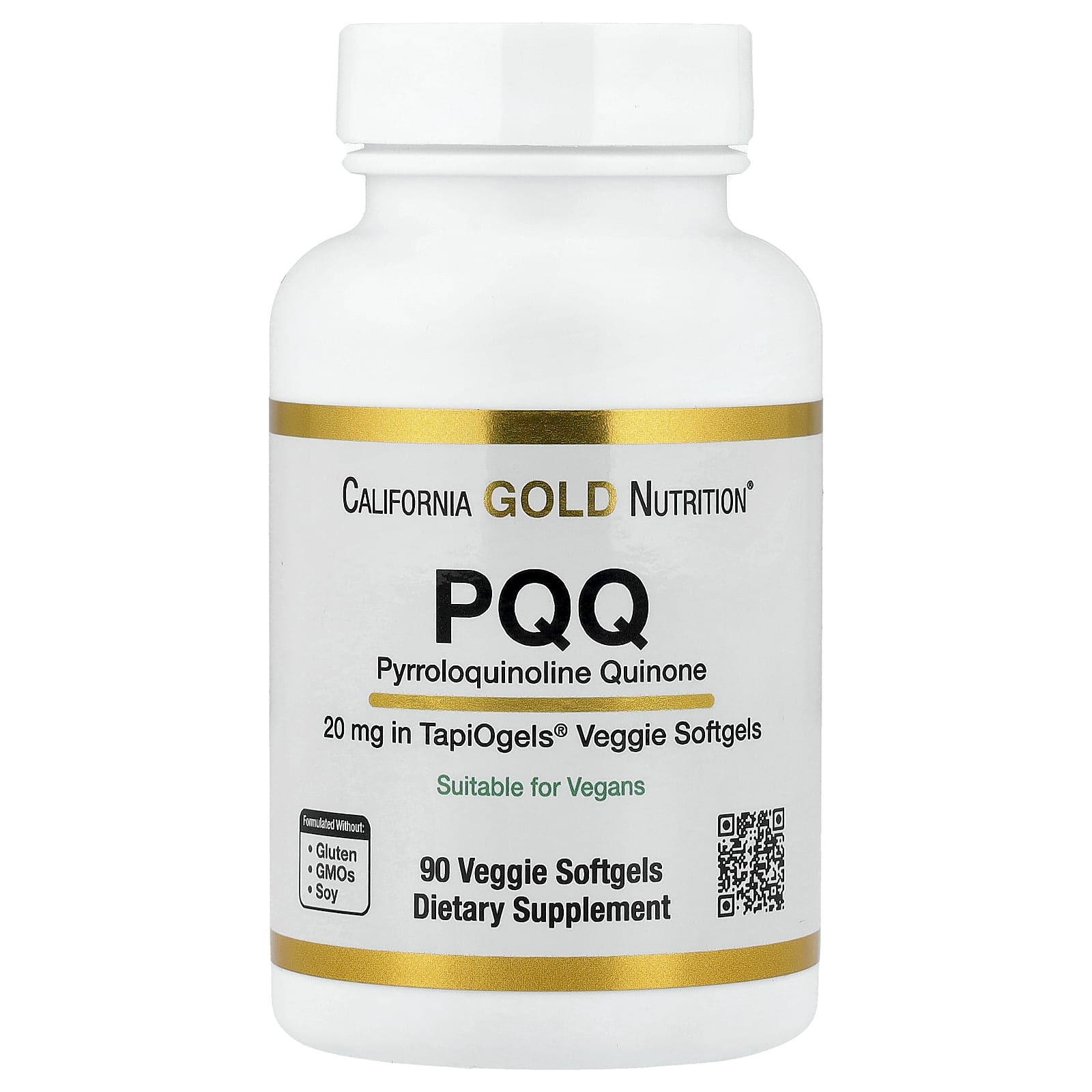 A PQQ da California Gold Nutrition® contém Pirroloquinolina Quinona PureQQ® em Cápsulas Softgel Vegetais de Tapioca TapiOgels™. Este suplemento é adequado a vegetarianos e veganos e é formulado sem glúten, OGMs ou soja.