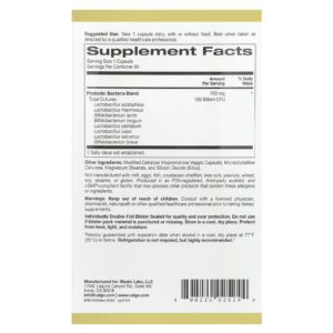 California Gold Nutrition Probióticos Lactobif® 100 contém 8 estirpes probióticas ativas², incluindo 5 Lactobacilos e 3 Bifidobactérias. Cada cápsula vegetal contém 100 bilhões de UFCs para fornecer ao corpo uma quantidade eficaz de bactérias benéficas.