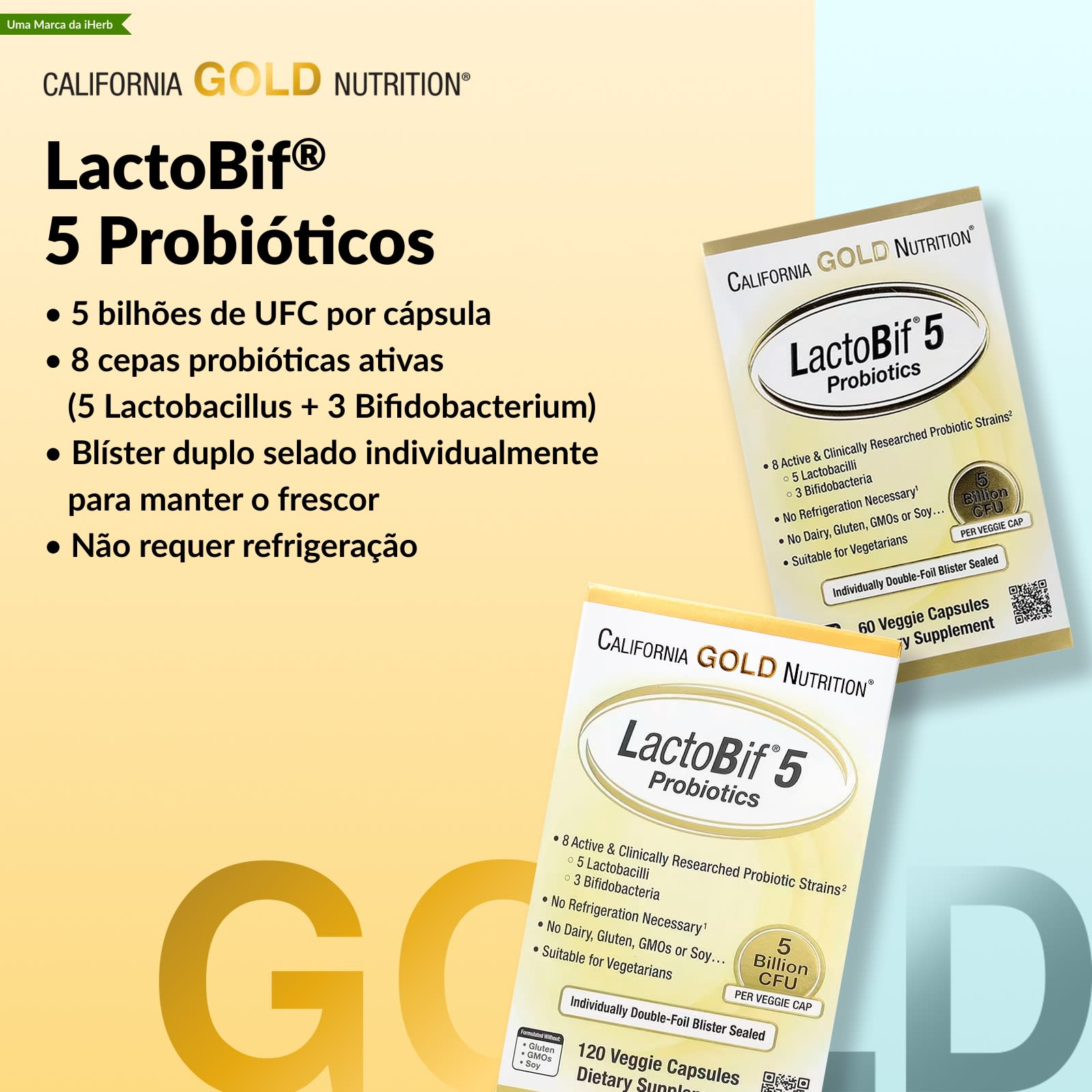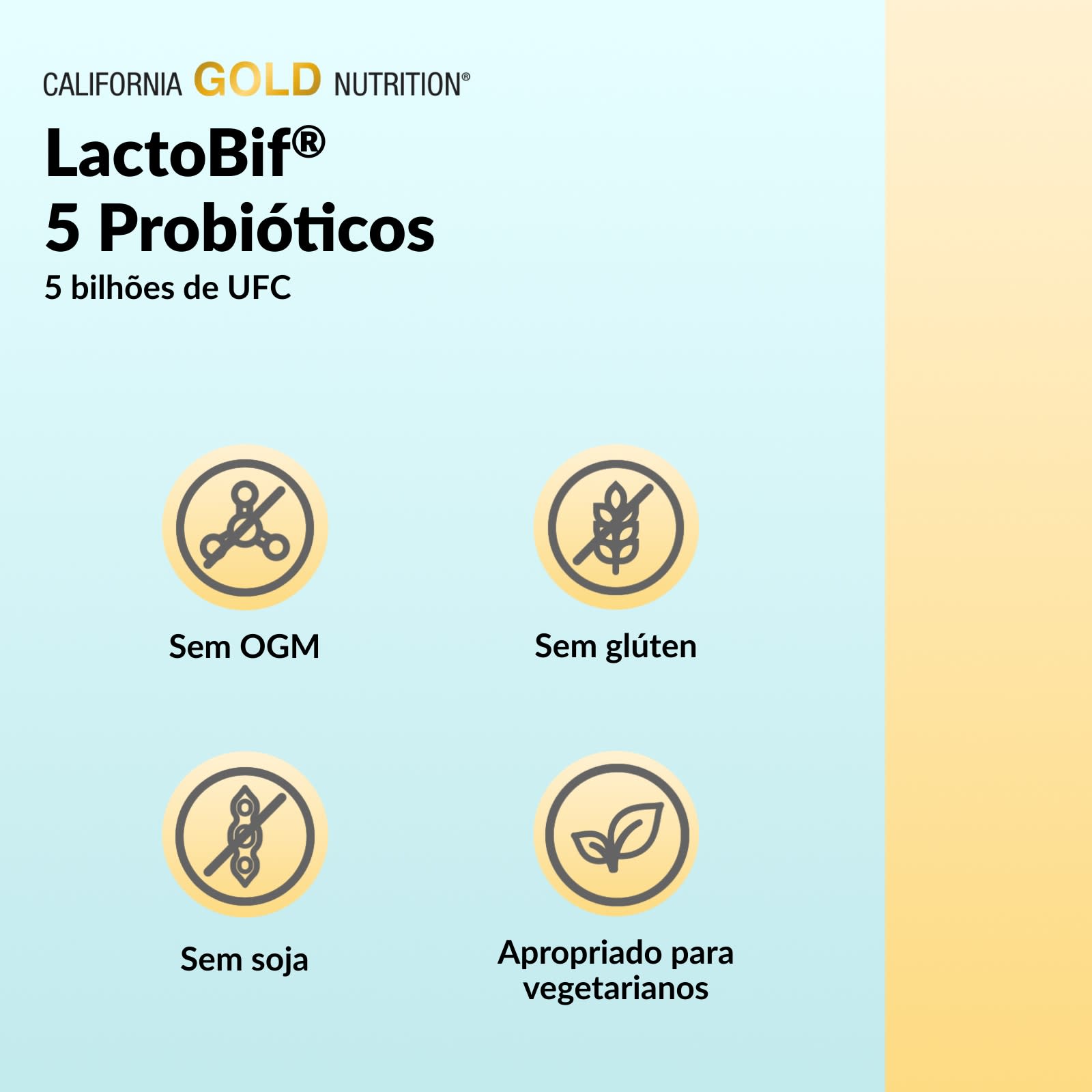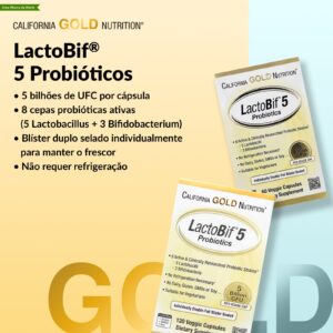 California Gold Nutrition Probióticos Lactobif® 5 contém 8 estirpes probióticas ativas, incluindo 5 Lactobacilos e 3 Bifidobactérias . Cada cápsula vegetal contém 5 bilhões de UFCs para fornecer ao corpo uma quantidade eficaz de bactérias benéficas.