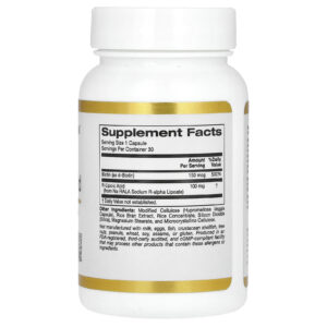 O Ácido R-lipoico Estabilizado da California Gold Nutrition contém Sodium R-Alpha Lipoate Na-RALA Bio-Enhanced® e biotina em cápsulas vegetais.