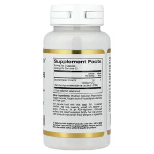 Saccharomyces boulardii da California Gold Nutrition® contém levedura probiótica com 10 bilhões de UFCs. Ele é formulado sem glúten, OGMs, soja ou laticínios e é adequado para vegetarianos e veganos. Quando tomado conforme as instruções, um frasco fornece quantidade suficiente para aproximadamente 1 mês.