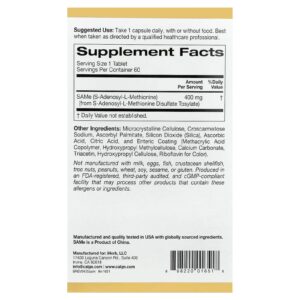 SAMe da California Gold Nutrition® contém S-adenosil-L-metionina proveniente do dissulfato de S-adenosil-L-metionina tosilato. Ele fornece esse composto em comprimidos com revestimento entérico para facilitar a suplementação em sua dieta.