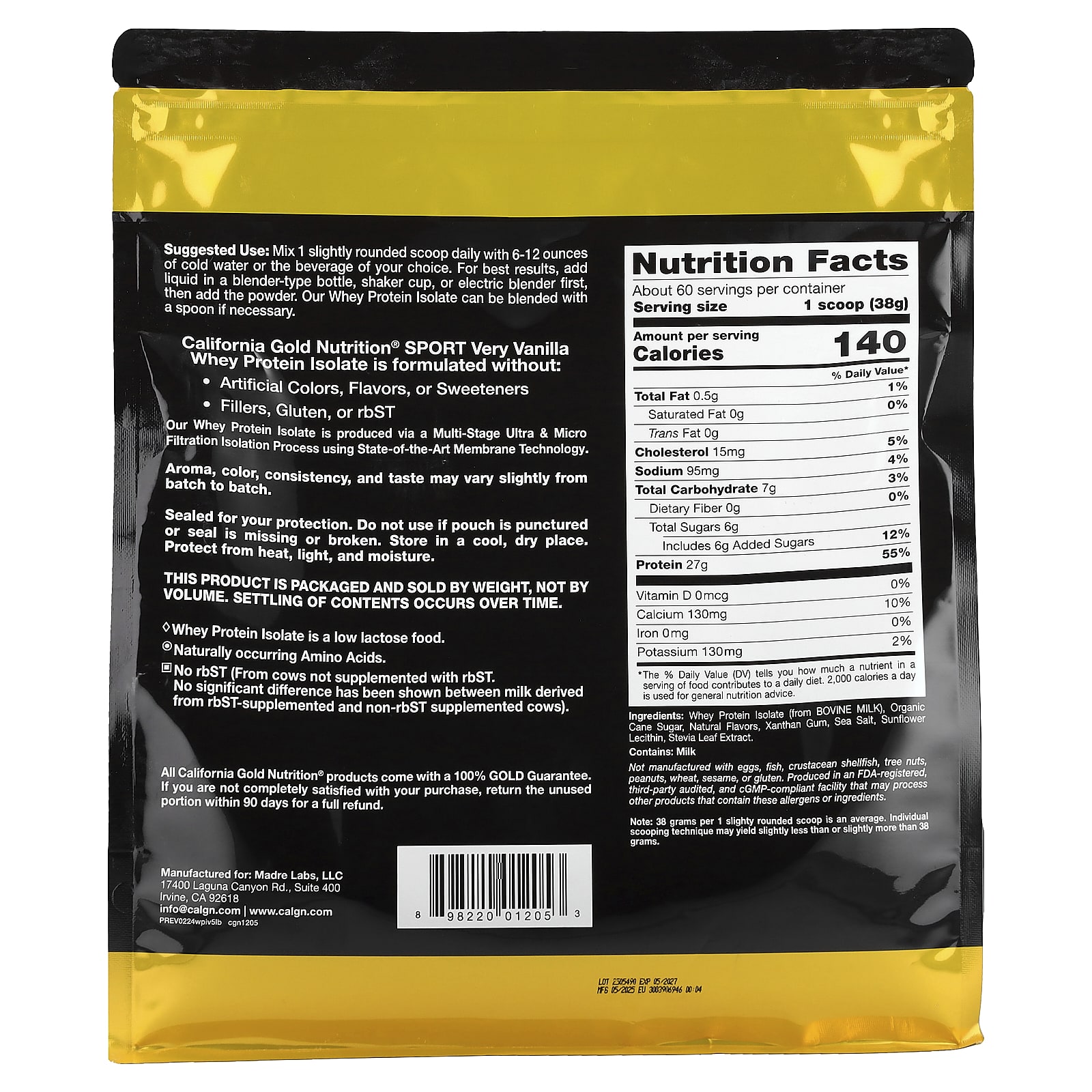 O Isolado de Whey Protein, Sabor Intenso de Baunilha da California Gold Nutrition Sport contém 25 gramas de proteína e 6 gramas de BCAAs por porção. Ele contém baixo teor de lactose e é fabricado por um processo de isolamento de microfiltragem a frio em vários estágios, usando tecnologia de membrana de última geração.