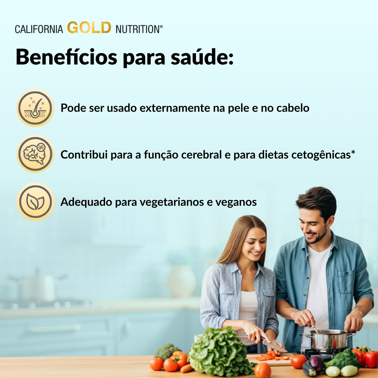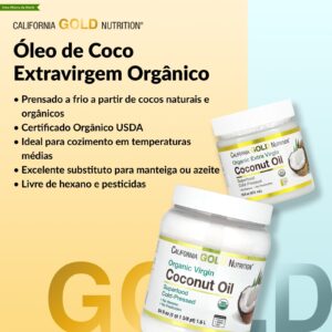 O Óleo de Coco Virgem Orgânico da California Gold Nutrition® é proveniente das Filipinas. É obtido por prensagem a frio a partir do líquido da carne do coco e, em seguida, o óleo é separado sem o uso de alvejante para produzir um óleo virgem suave e não refinado. Pode ser usado tanto de forma interna, sendo adicionado aos pratos e para cozinhar, quanto externa, nos cabelos e na pele.