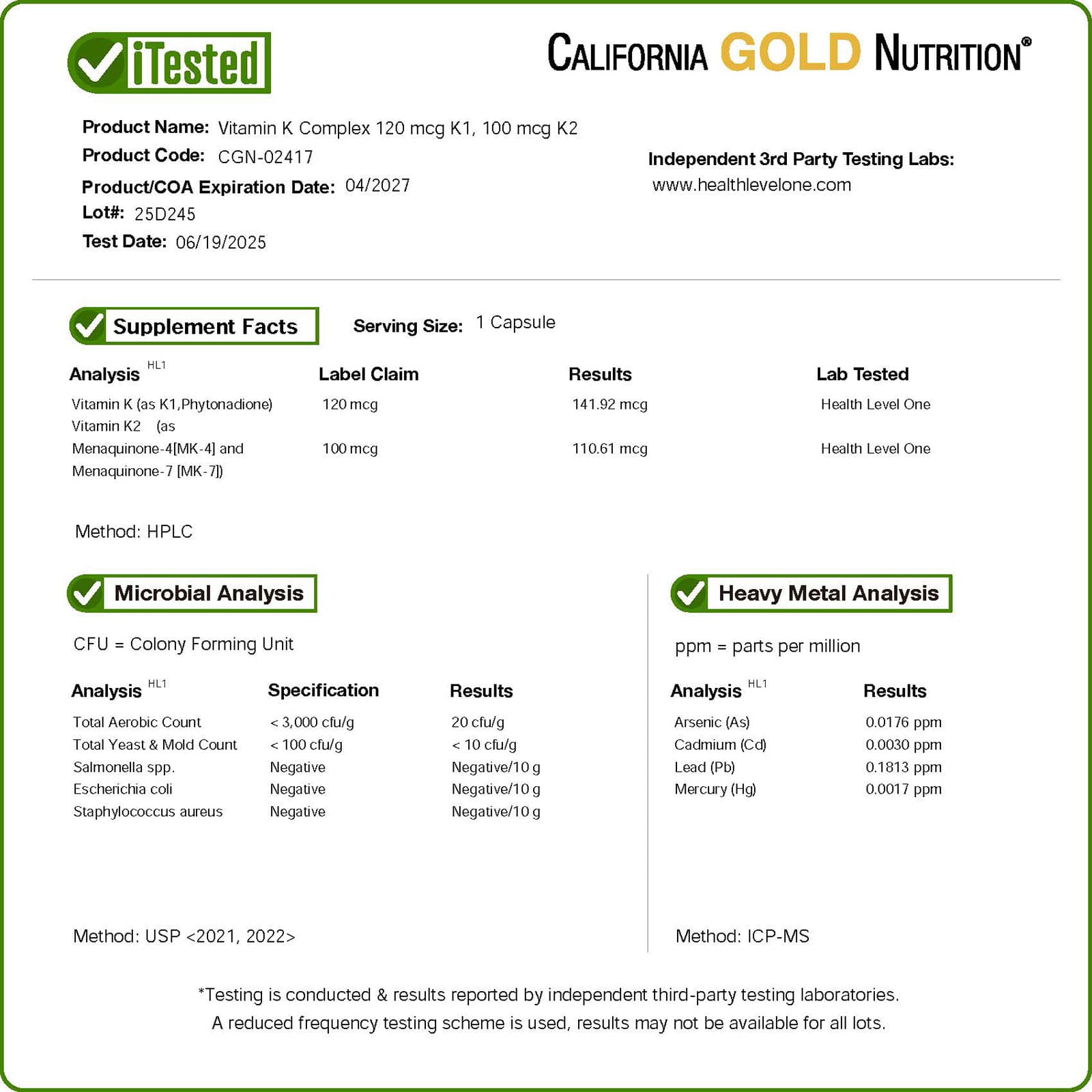 California Gold Nutrition Vitaminas do Complexo K 60 Cápsulas Vegetais