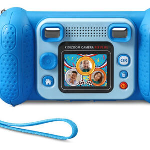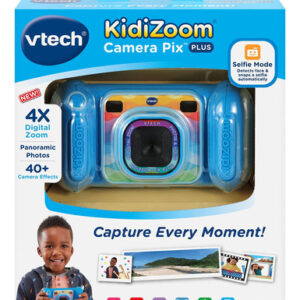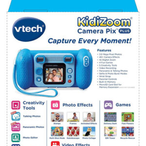VTech KidiZoom Camera Pix Plus, Blue – 2.0 megapixel digital camera with 4X zoom, 1.8 screen and four games; create a Talking Photo using your own photo, voice and voice effects – Experiment with 40+ camera effects like photo frames, stamps, kaleidoscope effects, collages, video themes and more – Stitch together 25 images to make a panoramic photo; create animations with up to 100 photos – MicroSD card slot for memory expansion up to 32GB (card not included); transfer data to computer (USB cord not included) – Intended for ages 38 years; requires 4 AA batteries; batteries not included. Kid-friendly photo and video camera with loads of creativity tools and special effects; makes the perfect birthday present or holiday gift for kids ages 38 years old