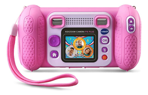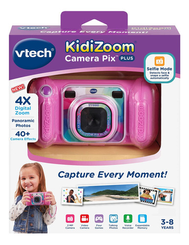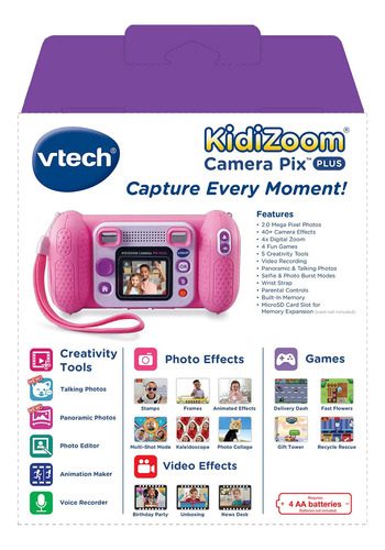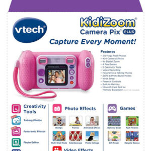 Câmera VTech KidiZoom Pix Plus, rosa – Câmera digital de 2,0 megapixels com zoom 4X, tela de 1,8 e quatro jogos; crie uma foto falante usando seus próprios efeitos de foto, voz e voz – Experimente com mais de 40 efeitos de câmera, como molduras, carimbos, efeitos de caleidoscópio, colagens, temas de vídeo e muito mais – Junte 25 imagens para criar uma foto panorâmica; crie animações com até 100 fotos – slot para cartão microSD para expansão de memória de até 32 GB (cartão não incluído); transferir dados para o computador (cabo USB não incluído) – Destinado a crianças de 38 anos; requer 4 pilhas AA; baterias não incluídas. Câmera de foto e vídeo para crianças com muitas ferramentas de criatividade e efeitos especiais; é o presente de aniversário ou de Natal perfeito para crianças de 38 anos