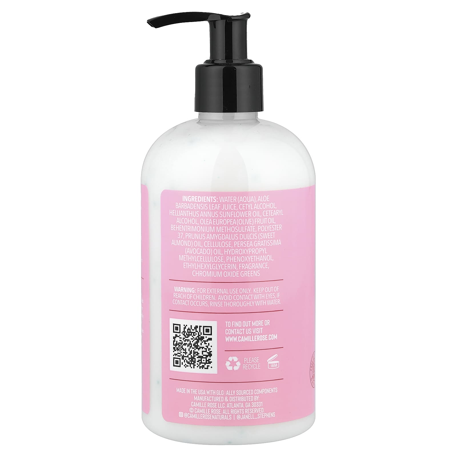 Água (aqua), suco da folha de Aloe barbadensis, álcool cetílico, óleo de girassol de Helianthus annuus, álcool cetoestearílico, óleo da fruta de Olea europaea (azeitona), behentrimonium methosulfate, poliéster 37, óleo de Prunus amygdalus dulcis (amêndoa doce), celulose, óleo de Persea gratissima (abacate), hidroxipropilmetilcelulose, fenoxietanol, ethylhexylglycerin, fragrância, óxido de cromo verde.