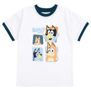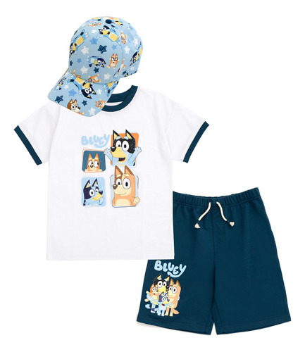 Seu filho está pronto para brincar com esta adorável roupa Bluey! Este conjunto confortável de camisa e shorts de manga curta vem com um boné de beisebol combinando e apresenta obras de arte vibrantes e coloridas em Bluey que seu filho vai adorar usar! Escolha entre designs fofos de Bluey e sua irmã Bingo, Bluey com Bingo, sua mãe Chilli e seu pai Bandit e Bluey com suas amigas Chloe, Coco, Honey, Indy, Missy, Mackenzie, Muffin e Snickers. Feito de um material macio e leve que mantém seu filho confortável, este elegante conjunto Bluey é a roupa perfeita para diversão e aventura durante todo o dia! – Conjunto oficial de roupas para meninos Bluey Bingo Bandit Chilli, 3 peças que misturam e combinam: camiseta estampada de manga curta, shorts e chapéu de caminhoneiro — gola redonda canelada; elegantes mangas caídas; braguilha sintética; fecho de puxar; fecho de cordão com elástico na cintura para um ajuste seguro e confortável; fecho de pressão ajustável na capa para um melhor ajuste; incrível arte com estampa digital — Durável e longa Conjunto estampado de camiseta, shorts e chapéu de caminhoneiro com um ajuste confortável e um design fácil de vestir, tornando-o a roupa essencial para seu filho ativo — Moda juvenil roupas com designs de personagens bacanas que seu filho adorará usar; camiseta, shorts e chapéu estilosos feitos de um material macio que protege a pele das crianças — perfeitas para esportes esportivos, presente de aniversário, presente de Natal, uso diário, brincadeiras ao ar livre, férias e dias quentes de verão