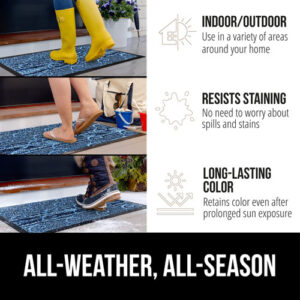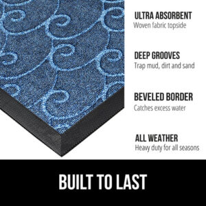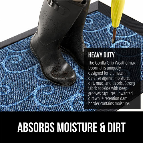 Are you tired of having to constantly clean and sweep away dirt, mud and debris from your home entry and exit ways? Our premium door mats are not only durable and long-lasting, they feature beautiful, stylish colors and patterns that will complement any home, doorstep or living space. Here are some things our customers want to know: What makes your door mats so durable? Our door mats are constructed of the highest quality, natural durable rubber that feature a textured underside that works on clean, smooth floor surfaces. How exactly does the mat capture dirt and mud? Weve intentionally designed our door mats with solid, heavy-duty beveled rubber borders to help keep dirt and moisture trapped in the absorbent mat fabric and off your floors. Plus, the polypropylene fabric is fast drying so your mat and floors stay dry. Can I use this mat under low-clearing doors? Yes, our mat is designed with a .25 inch low-pile for most low-clearing doors or entryways. This mat is perfect for both interior or exterior spaces.> How do I clean this mat? Its easy! For a quick clean, simply vacuum with a hand-held or regular sized vacuum. You mat can also spot clean the mat using a mild soap and a damp cloth. For deeper cleans, take the mat outdoors and use a garden hose to rinse off. Always air dry. Never use bleach on the mat. – Heavy Duty All Weather Doormat: The Gorilla Grip WeatherMax doormat is durably designed to withstand all weather conditions, from snow and rain to mud and sand; the all season mat features deep grooves that help capture moisture, dirt and debris – Absorbs Moisture and Dirt: strong, rubber beveled border helps to form a retention dam to capture moisture, mud or other messy unwanted debris from tracking into your home; the slightly raised polypropylene fabric helps to trap dirt within its patterned grooves and dries quickly – Textured Rubber Backing: constructed with a durable textured rubber backing – Stain and Fade Resistant: stain and fade resistant topside for long lasting use both inside and outside your home – Durable for High Traffic Areas: ultra strong for high traffic areas and busy homes; .25 inch slim low profile design is ideal for low clearing doors or entryways; mat measures 17 by 29 inches