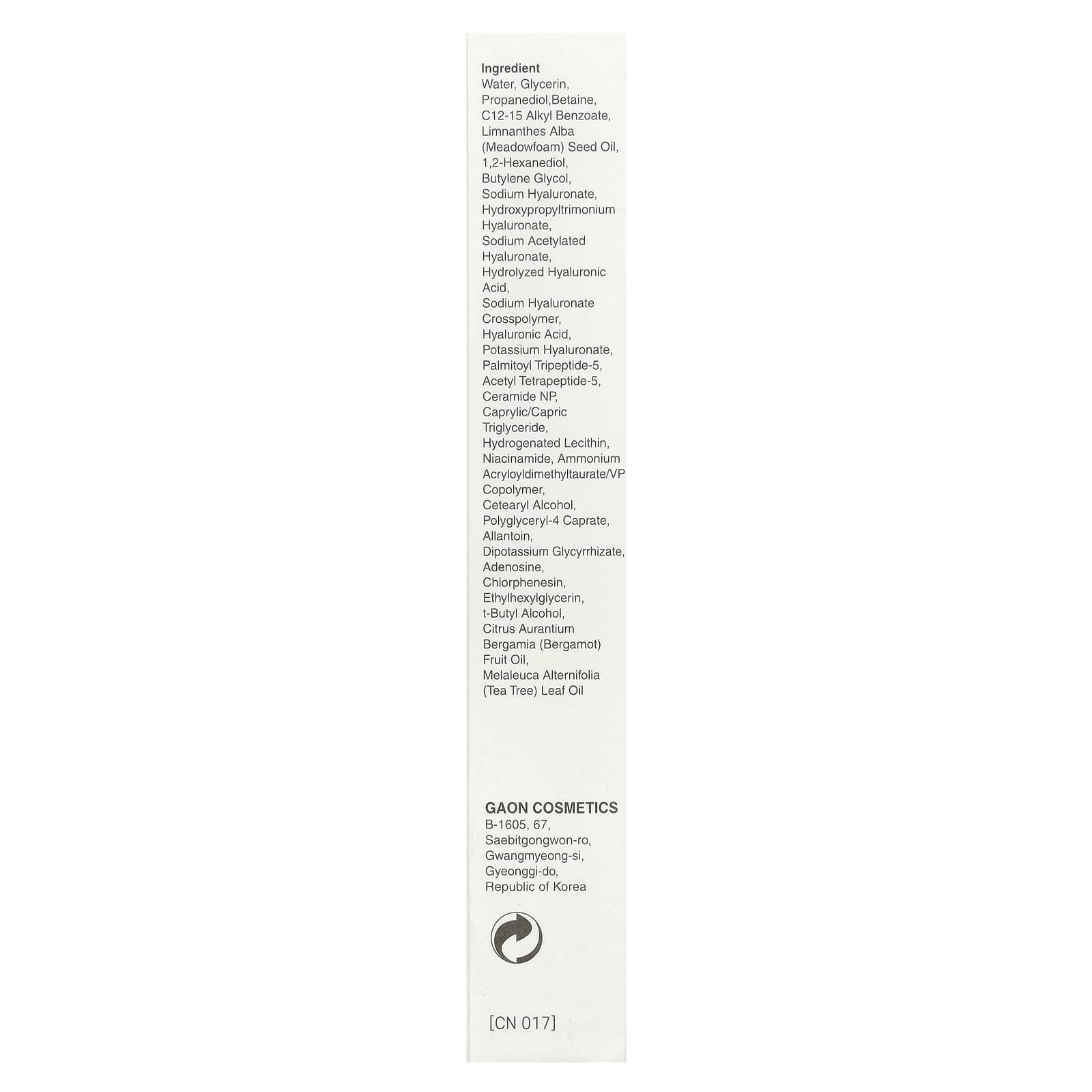Água, glicerina, propanediol, betaína, c12-15 alkyl benzoate, óleo da semente de Limnanthes alba (meadowfoam), 1,2-hexanediol, butilenoglicol, hialuronato de sódio, hydroxypropyltrimonium hyaluronate, sodium acetylated hyaluronate, ácido hialurônico hidrolisado, sodium hyaluronate crosspolymer, ácido hialurônico, hialuronato de potássio, palmitoyl tripeptide-5, tetrapeptídeo-5 de acetil, ceramida NP, caprylic/capric triglyceride, lecitina hidrogenada, nicotinamida, ammonium acryloyldimethyltaurate/vp copolymer, álcool cetoestearílico, polyglyceryl-4 caprate, alantoína, dipotassium glycyrrhizate, adenosina, clorfenesina, ethylhexylglycerin, terc-butanol, óleo da fruta de Citrus aurantium bergamia (bergamota), óleo da folha de Melaleuca alternifolia (melaleuca).