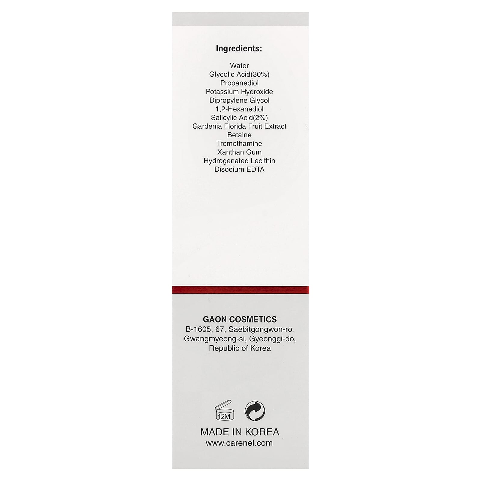 Água, ácido glicólico (30%), propanodiol, hidróxido de potássio, dipropilenoglicol, 1,2-hexanodiol, ácido salicílico (2%), Extrato de fruta de gardênia flórida, betaína, Trometamina, goma xantana, lecitina hidrogenada, EDTA dissódico.