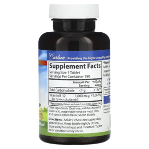 Carlson B-12 Mastigável Limão Natural 1.000 mcg 180 Comprimidos – Carlson Suplementos Vitaminas Vitamina B Vitamina B12 (Cobalamina).