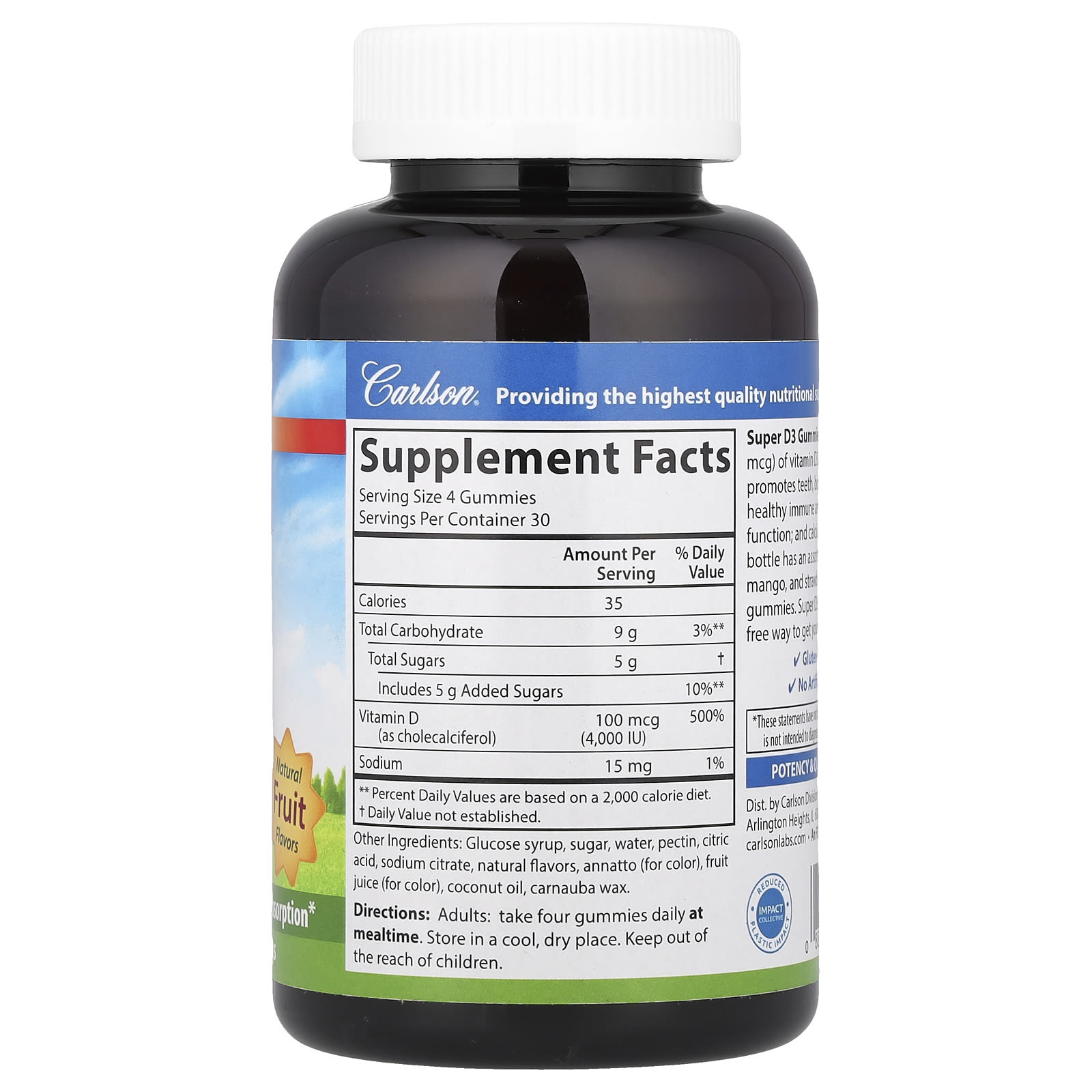 Carlson Gomas Super D3 Frutas Naturais 120 Gomas Vegetarianas (25 mcg (1.000 UI) por Goma) – Carlson Suplementos Vitaminas Vitamina D.