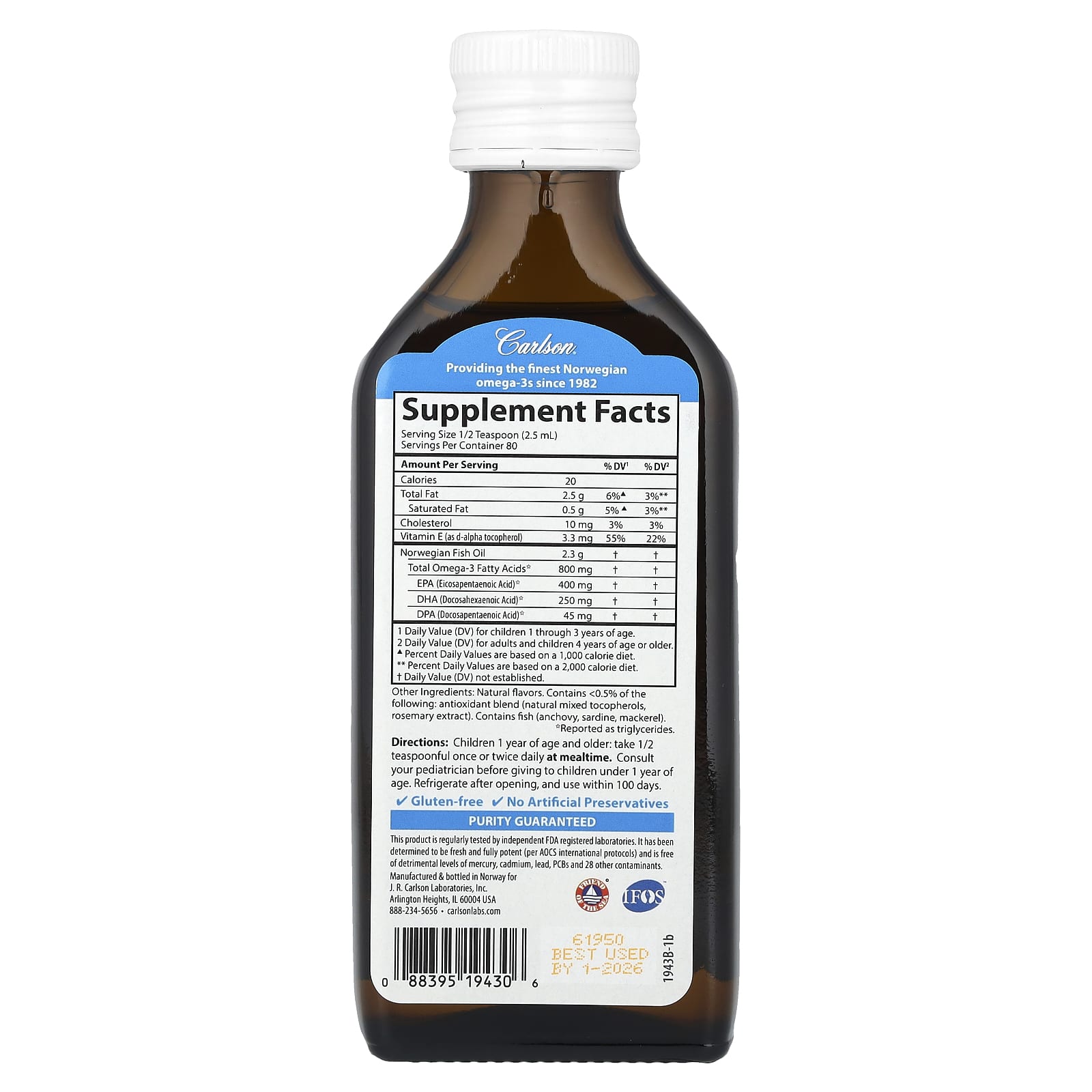 Este produto é testado regularmente por laboratórios independentes registrados pela FDA. Foi determinado que é fresco e totalmente potente (de acordo com os protocolos internacionais da AOCS) e não contém níveis prejudiciais de mercúrio, cádmio, chumbo, PCBs e 28 outros contaminantes.