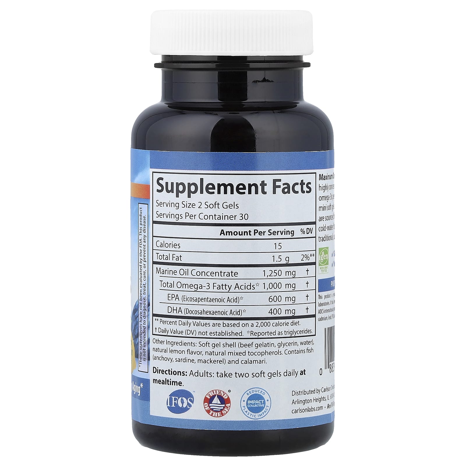 Carlson Maximum Omega Minis Limão Natural 60 Minicápsulas Softgel (500 mg por Cápsula Softgel) – Carlson Suplementos Ômegas e Óleos de Peixe (EPA/DHA).