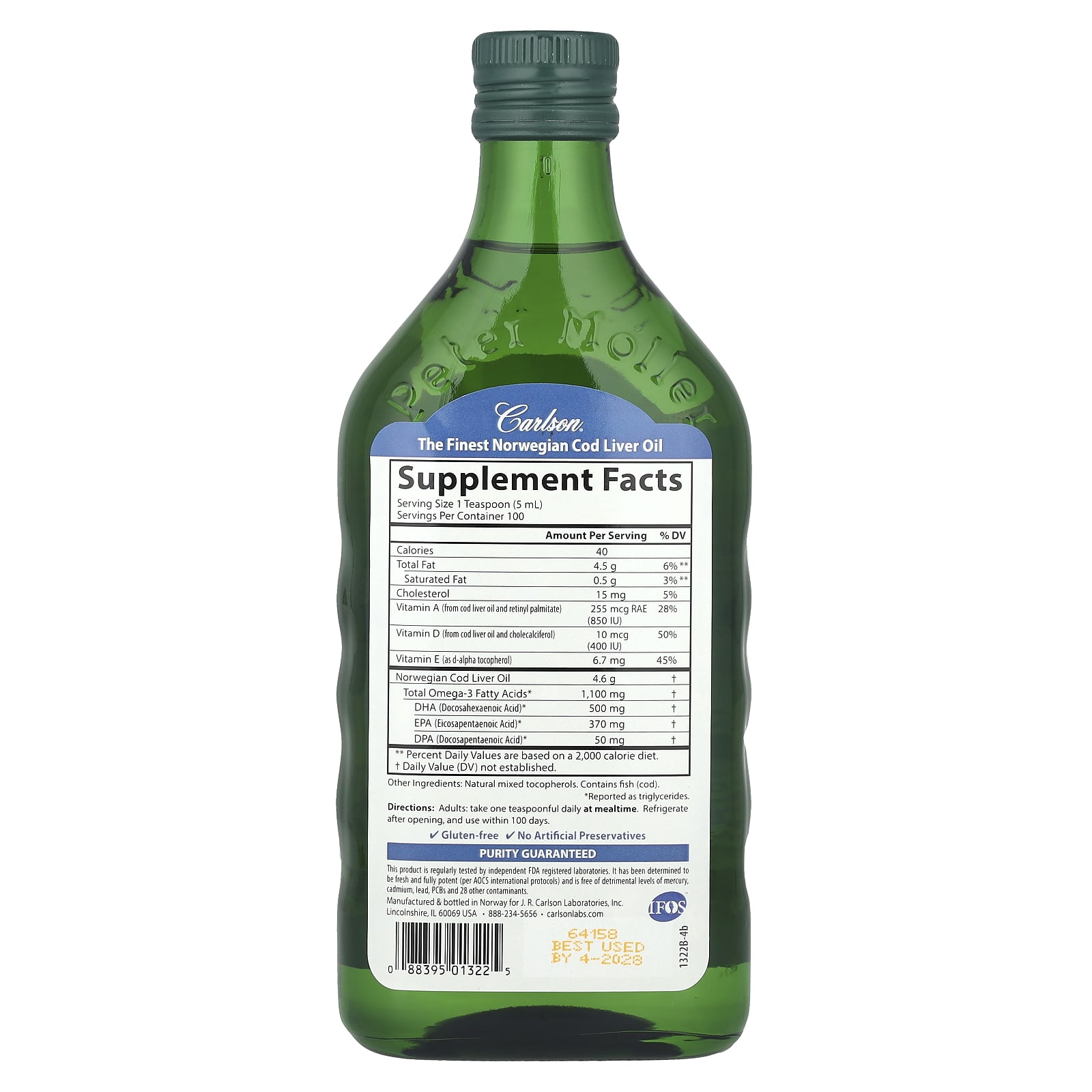 Este produto é testado regularmente por laboratórios independentes registrados pelo FDA. Foi determinado que é fresco e totalmente potente (de acordo com os protocolos internacionais da AOCS) e não contém níveis prejudiciais de mercúrio, cádmio, chumbo, PCBs e 28 outros contaminantes.