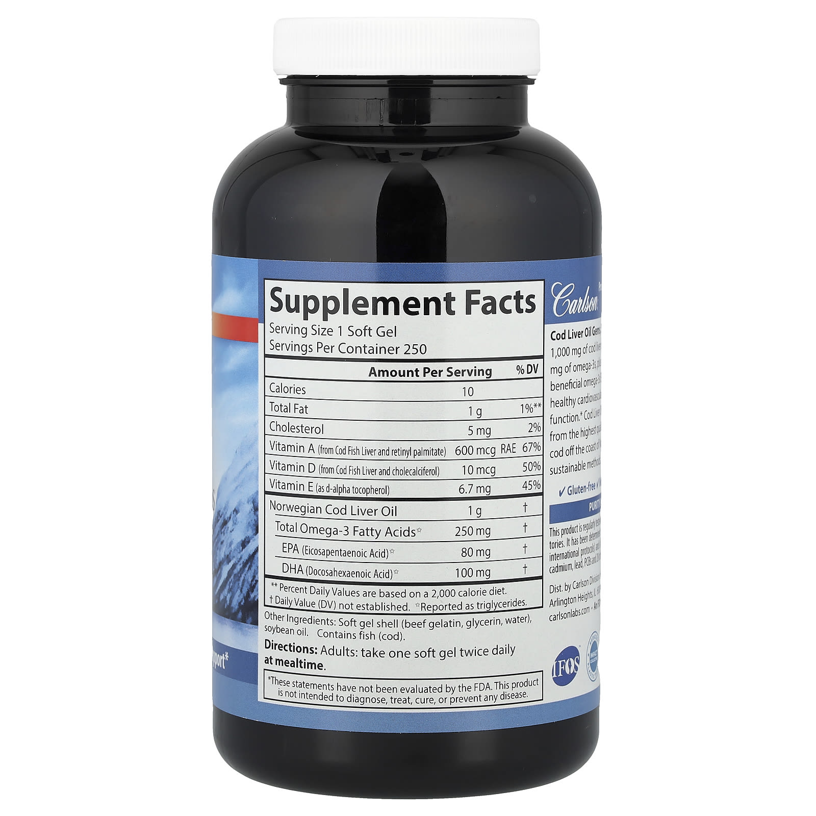 Carlson Wild Norwegian Cod Liver Oil Gems Super 1.000 mg 250 Cápsulas Softgel – Carlson Suplementos Ômegas e Óleos de Peixe (EPA/DHA) Óleo de Fígado de Bacalhau.