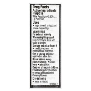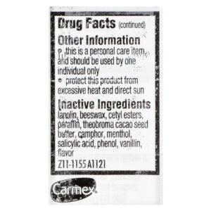 | Ingredientes Inativos: Lanolina, cera de abelha, ésteres cetílicos, parafina, manteiga da semente de Theobroma cacao, cânfora, mentol, ácido salicílico, fenol, vanilina, sabor. | |
