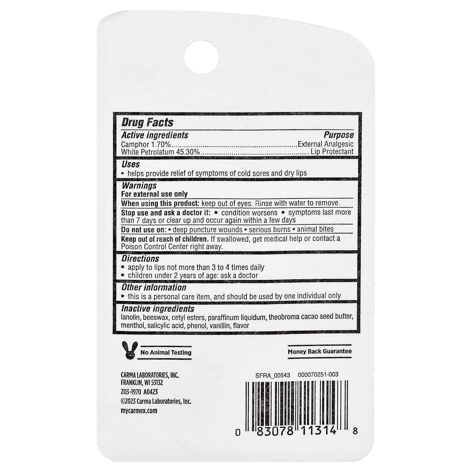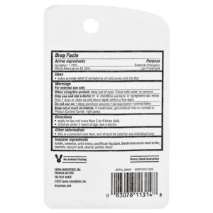 | Ingredientes Inativos Lanolina, ésteres cetílicos, manteiga de semente de teobroma cacau, parafina líquida, cera de abelha, mentol, ácido salicílico, fenol, vanilina, sabor |