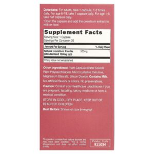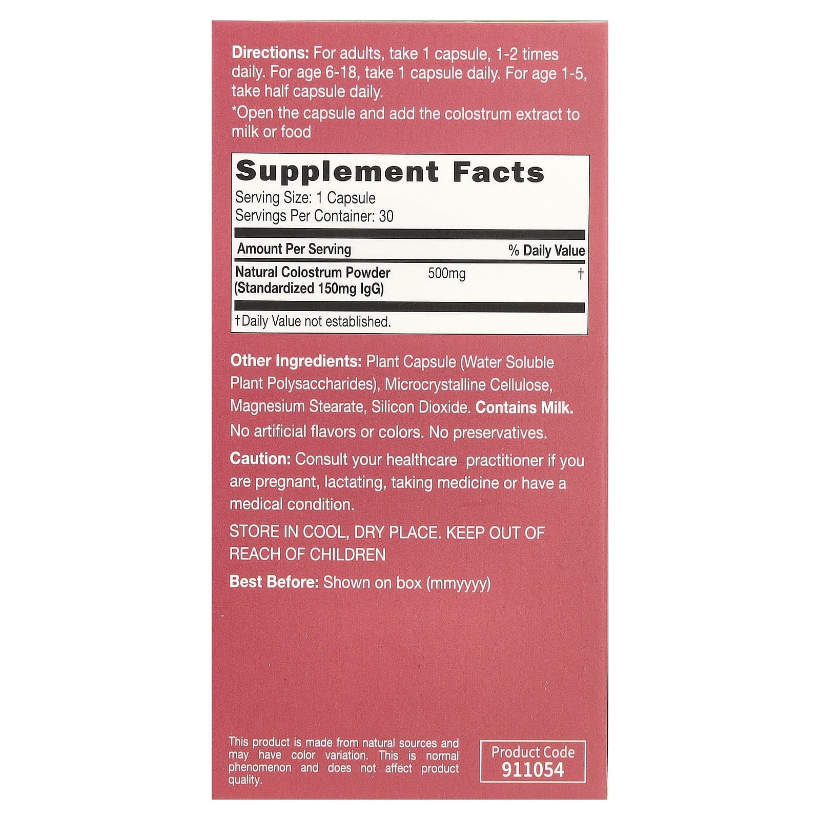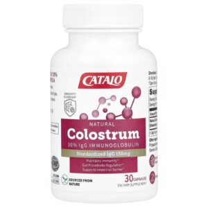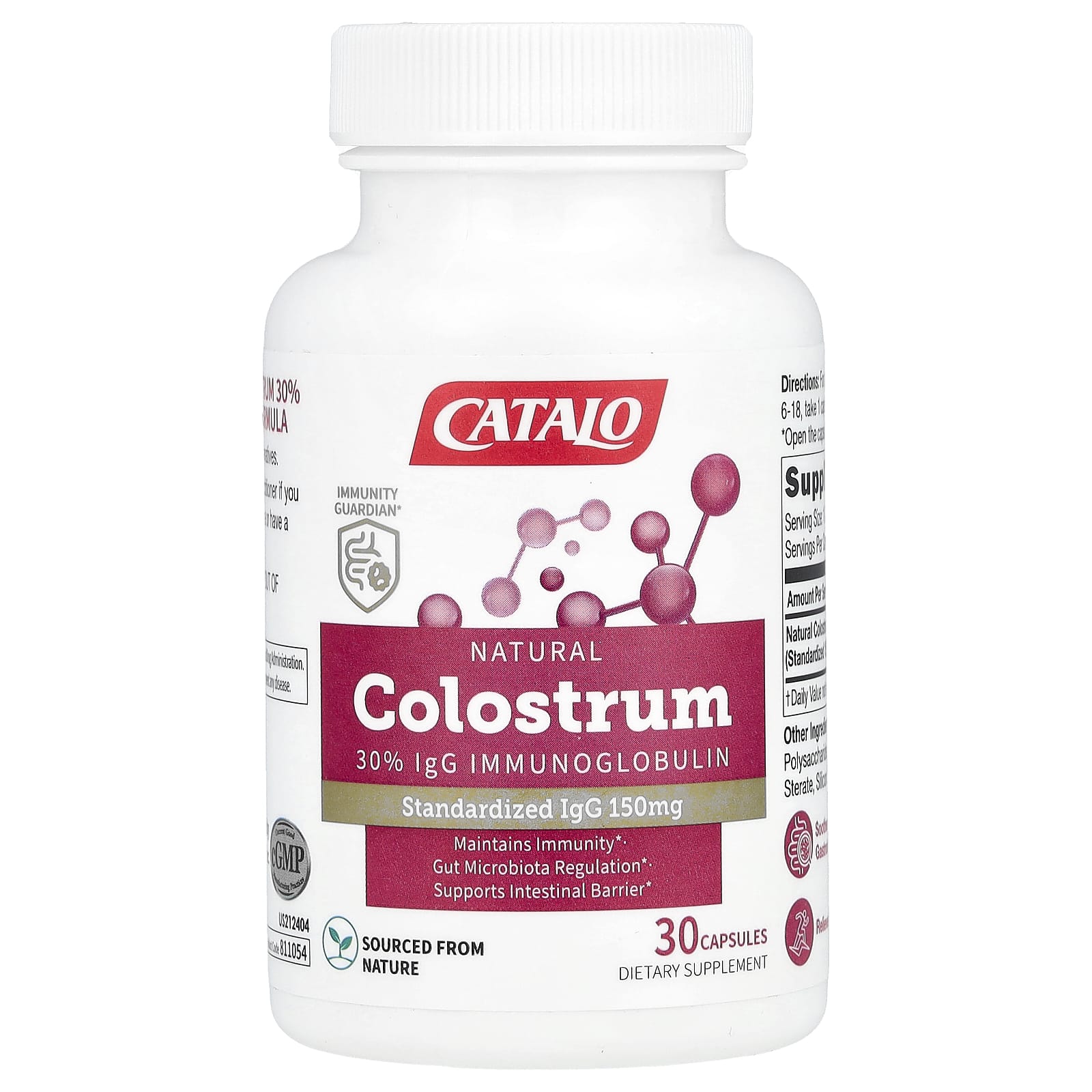 A Fórmula de Colostro Natural com 30% de Imunoglobulina IgG da CATALO é feita com colostro premium e não contaminada, produzida por vacas saudáveis dentro de 24 horas após o parto nos EUA. Ele é processado por técnicas de baixa pressão e baixa temperatura para obter uma alta concentração de extrato de colostro com máxima bioatividade. O extrato de colostro é rico em cinco imunoglobulinas ativas naturais: IgG, IgA, IgE, IgM e IgD, sendo IgG o mais abundante. A IgG no colostro mantém a imunidade. Também trata de problemas gastrointestinais comuns e sintomas alérgicos, além de combater a fadiga e a fraqueza. Cada cápsula contém 500 mg de extrato de colostro, com um conteúdo lgG padronizado de até 150 mg.