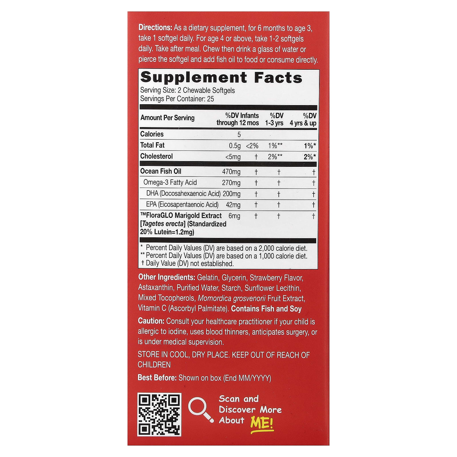 Gelatina, glicerina, sabor de morango, astaxantina, água purificada, amido, lecitina de girassol, tocoferóis mistos, extrato da fruta Momordica grosvenorii, vitamina C (palmitato de ascorbila). contém peixe (anchova, sardinha e cavala) e soja.