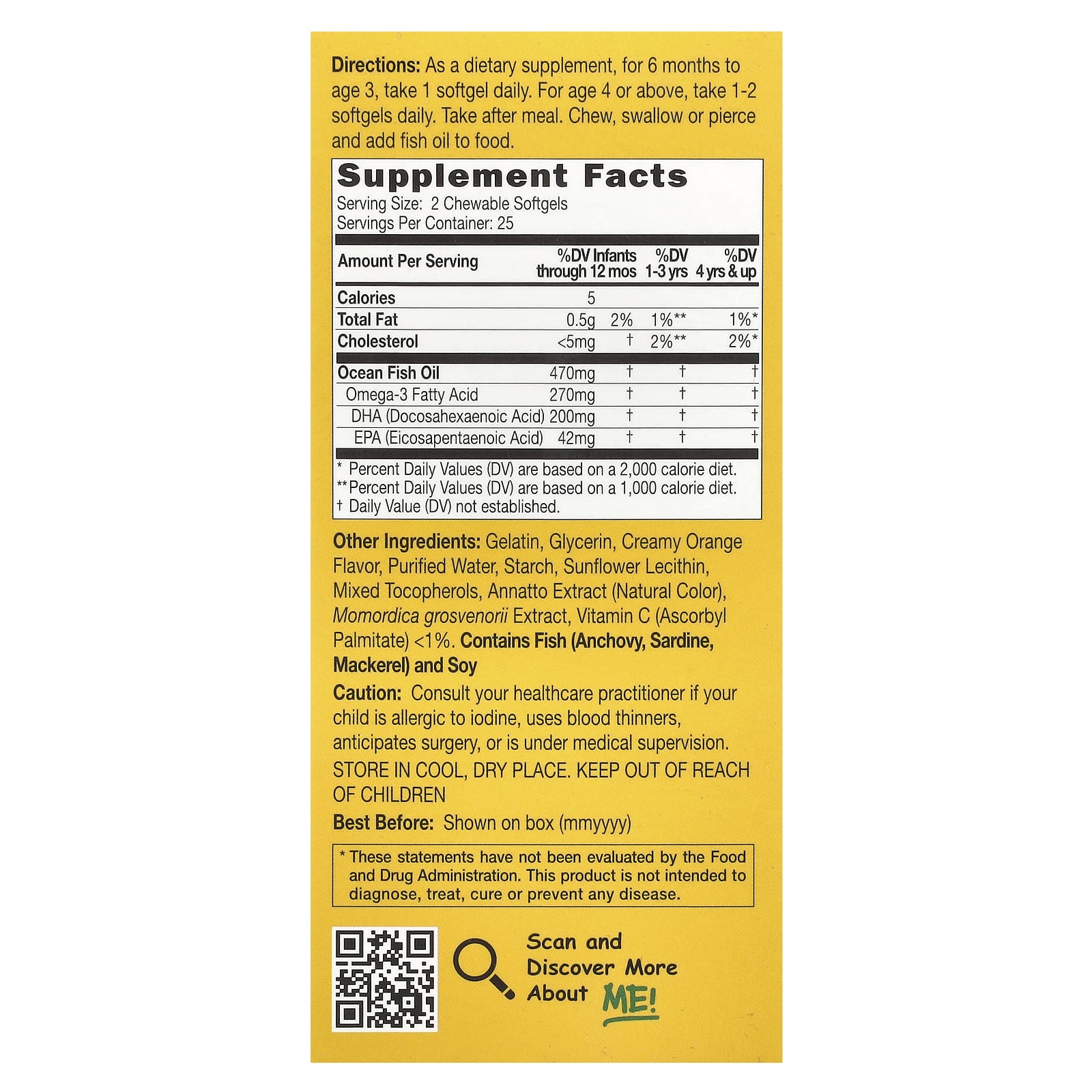 Como suplemento, de 6 meses a 3 anos de idade, tome 1 cápsula softgel por dia. Para crianças maiores de 4 anos, tome de 1 a 2 cápsulas softgel por dia. Tome após a refeição. Mastigue, engula ou perfure e adicione óleo de peixe à comida.