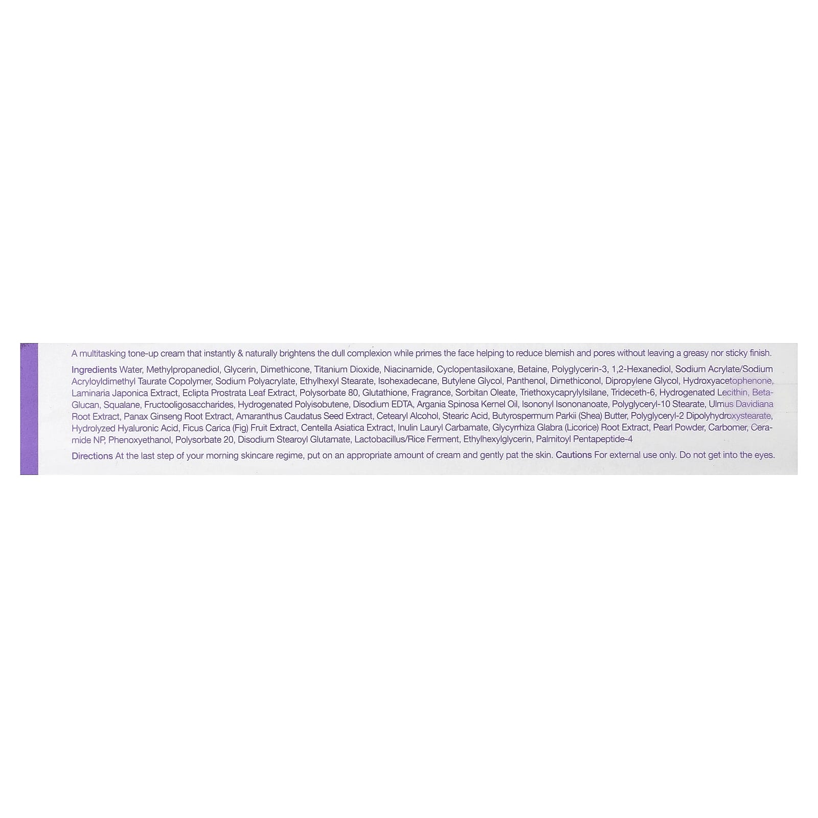 Água, methylpropanediol, glicerina, dimeticona, dióxido de titânio, nicotinamida, ciclopentasiloxano, betaína, poliglicerina-3,1,2-hexanediol, sodium acrylate/sodium acryloyldimethyl taurate copolymer, sodium polyacrylate, estearato de octila, isohexadecane, butilenoglicol, pantenol, dimeticonol, dimetildietilenoglicol, hydroxyacetophenone, extrato de Laminaria japonica, extrato da folha de Eclipta prostrata, polissorbato 80, glutationa, fragrância, oleato de sorbitana, triethoxycaprylylsilane, trideceth-6, lecitina hidrogenada, betaglucano, esqualano, fruto-oligossacarídeos, poliisobuteno hidrogenado, edetato dissódico, óleo do grão de Argania spinosa, isononyl isononanoate, polyglyceryl-10 stearate, extrato da raiz de Ulmus davidiana, extrato da raiz de Panax ginseng, extrato da semente de Amaranthus caudatus, álcool cetoestearílico, ácido esteárico, manteiga de Butyrospermum parkii (karité), polyglyceryl-2 dipolyhydroxystearate, ácido hialurônico hidrolisado, extrato da fruta de Ficus carica (figo), extrato de Centella asiatica, inulin lauryl carbamate, extrato da raiz de Glycyrrhiza glabra (alcaçuz), pó de pérola, carbômero, ceramida NP, fenoxietanol, polissorbato 20, disodium stearoyl glutamate, lactobacillus/fermento de arroz, ethylhexylglycerin, palmitoil pentapeptídeo-4.