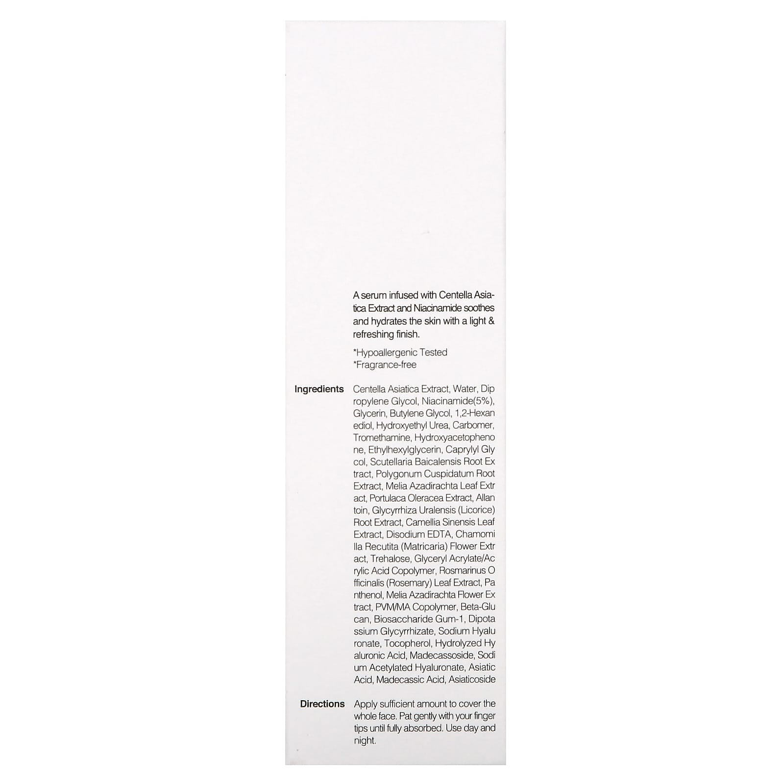 Extrato de Centella asiatica, água, dimetildietilenoglicol, nicotinamida (5%), glicerina, butylene glycol, 1,2-hexanediol, hydroxyethyl urea, carbômero, trometamol, hydroxyacetophenone, ethylhexylglycerin, caprylyl gly col, extrato da raiz de Scutellaria baicalensis, extrato da raiz de Polygonum cuspidatum, extrato da folha de Melia azadirachta, extrato de Portulaca oleracea, alantoína, extrato da raiz de Glycyrrhiza uralensis (alcaçuz), extrato da folha de Camellia sinensis, edetato dissódico, extrato da flor de Chamomilla recutita (matricária), trealose, glyceryl acrylate/acrylic acid copolymer, extrato da folha de Rosmarinus officinalis (alecrim), pantenol, extrato da flor de Melia azadirachta, pvm/ma copolymer, betaglucano, biosaccharide gum-1, dipotassium glycyrrhizate, hialuronato de sódio, tocoferol, ácido hialurônico hidrolisado, madecassoside, sodium acetylated hyaluronate, asiatic acid, ácido madecássico, asiaticoside.