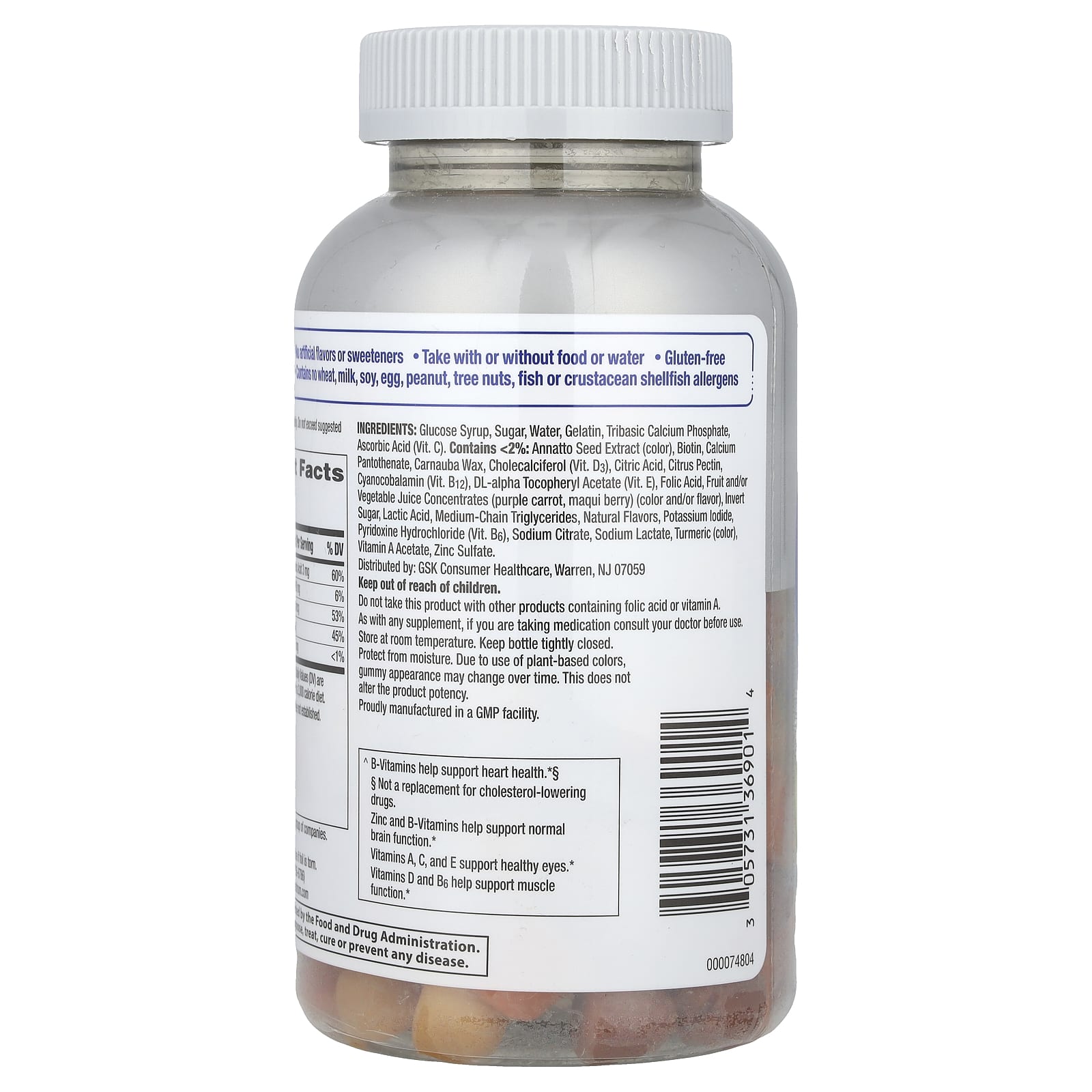 Xarope de glicose, açúcar, água, gelatina, fosfato de cálcio tribásico, ácido ascórbico (vit.c), extrato da semente de urucum (corante), biotina, pantotenato de cálcio, cera de carnaúba, colecalciferol (vit. D3), ácido cítrico, pectina cítrica, cianocobalamina (vit. B12), Acetato de dextroalfatocoferol (vit. E), ácido fólico, concentrado de suco de frutas e/ou vegetais (cenoura roxa, baga de maqui) (corante e/ou sabor), açúcar invertido, ácido láctico, triglicerídeos de cadeia média, sabores naturais, iodeto de potássio, cloridrato de piridoxina (vit. B6), citrato de sódio, lactato de sódio, cúrcuma (corante), acetato de vitamina A, sulfato de zinco.