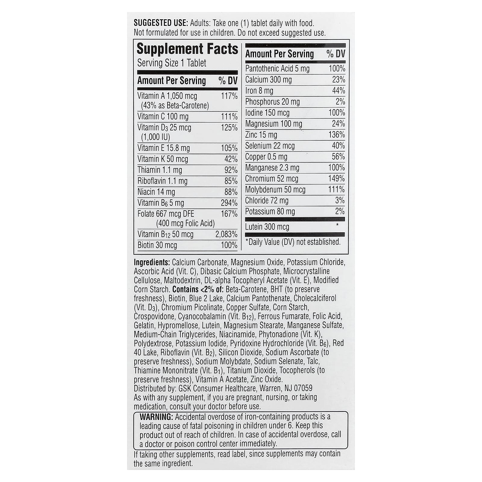 Carbonato de cálcio, óxido de magnésio, cloreto de potássio, ácido ascórbico (vit. c), fosfato de cálcio dibásico, celulose microcristalina, maltodextrina, acetato de dl-alfa tocoferol (vit. e), amido de milho modificado. Contém & amp; lt; 2% de: betacaroteno, bht (para preservar o frescor), biotina, azul de indigotina laca de alumínio, pantotenato de cálcio, colecalciferol (vit. d3), picolinato de cromo, sulfato de cobre, amido de milho, crospovidona, cianocobalamina (vit. b12), fumarato ferroso, ácido fólico, gelatina, hipromelose, luteína, estearato de magnésio, sulfato de manganês, triglicerídeos de cadeia média, nicotinamida, fitonadiona (vit. k), polidextrose, iodeto de potássio, cloridrato de piridoxina (vit. b6), vermelho 40 laca de alumínio, riboflavina (vit. b2), dióxido de silício, ascorbato de sódio (para preservar o frescor), molibdato de sódio, selenato de sódio, talco, mononitrato de tiamina (vit. b1), dióxido de titânio, tocoferóis (para preservar o frescor), acetato de vitamina A, óxido de zinco.