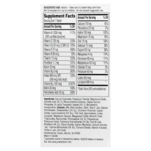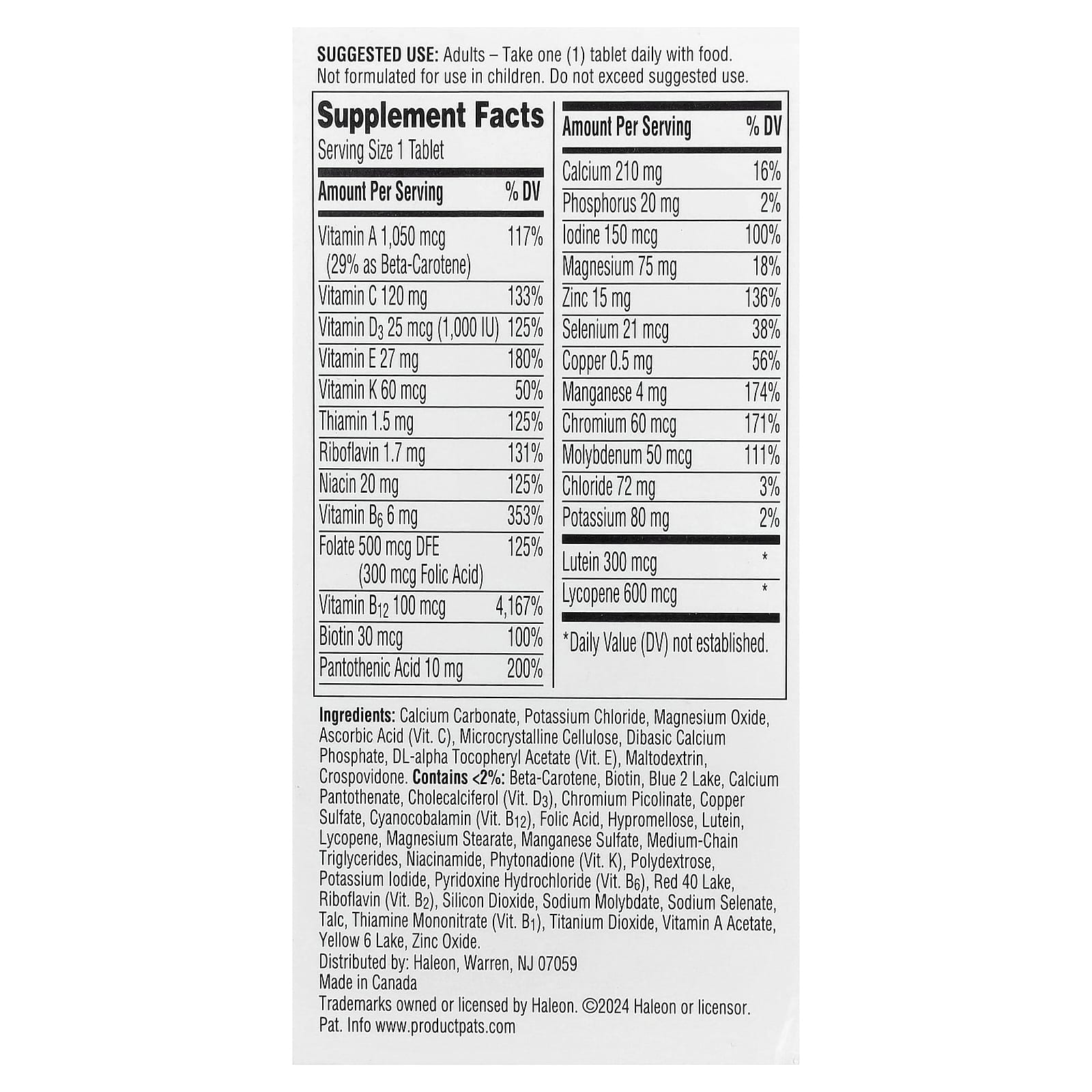 Carbonato de cálcio, cloreto de potássio, óxido de magnésio, ácido ascórbico (vit. C), celulose microcristalina, fosfato de cálcio dibásico, acetato de dextroalfatocoferol (vit. E), Maltodextrina, crospovidona.Contém <2% de: betacaroteno, biotina, azul de indigotina laca de alumínio, pantotenato de cálcio, colecalciferol (vit. D3), picolinato de cromo, sulfato de cobre, cianocobalamina (vit. B12), ácido fólico, hipromelose, luteína, licopeno, estearato de magnésio, sulfato de manganês, triglicerídeos de cadeia média, Niacinamida, fitomenadiona (vit. K), em polidextrose, iodeto de potássio, cloridrato de piridoxina (vit. B6), vermelho 40 laca de alumínio, riboflavina (vit. B2), dióxido do silicone, molibdato de sódio, selenato de sódio, talco, mononitrato de tiamina (vit. B1), dióxido de titânio, acetato de vitamina A, amarelo crepúsculo laca de alumínio, óxido de zinco.