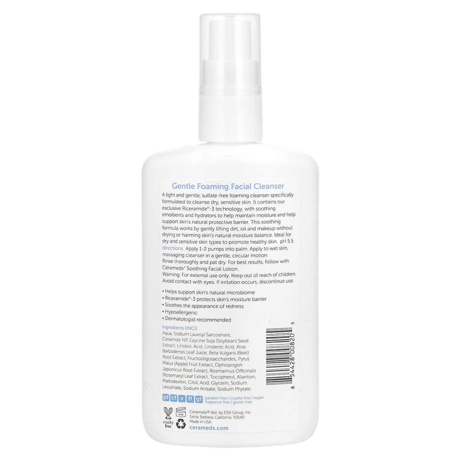 Uma espuma de limpeza leve e suave, sem sulfato, especificamente formulada para limpar a pele seca e sensível. Ele contém nossa tecnologia exclusiva Riceramide®-3, com emolientes calmantes e hidratantes para ajudar a manter a hidratação e reforçar a barreira protetora natural da pele. Esta fórmula calmante age removendo suavemente a sujeira, o óleo e a maquiagem sem ressecar ou prejudicar o equilíbrio de hidratação natural da pele. Ideal para peles secas e sensíveis para promover uma pele saudável. pH 5,5
