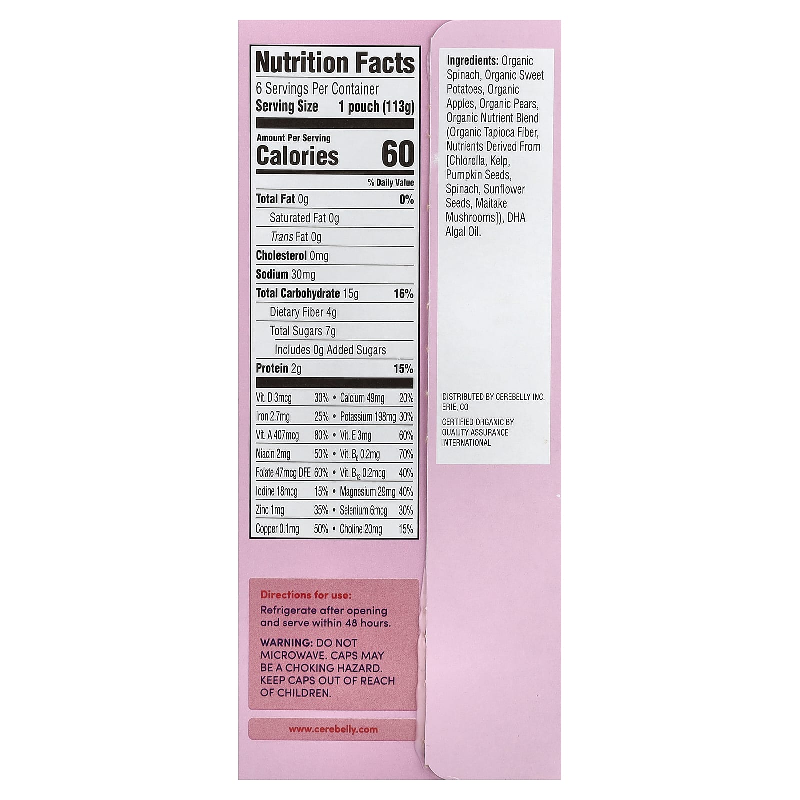 espinafre orgânico, batata-doce orgânica, maçãs orgânicas, peras orgânicas, mistura de nutrientes orgânicos (fibra de tapioca orgânica, nutrientes derivados de [chlorella, alga marinha, sementes de abóbora, espinafre, sementes de girassol, cogumelos imatake]), óleo de algas dha.