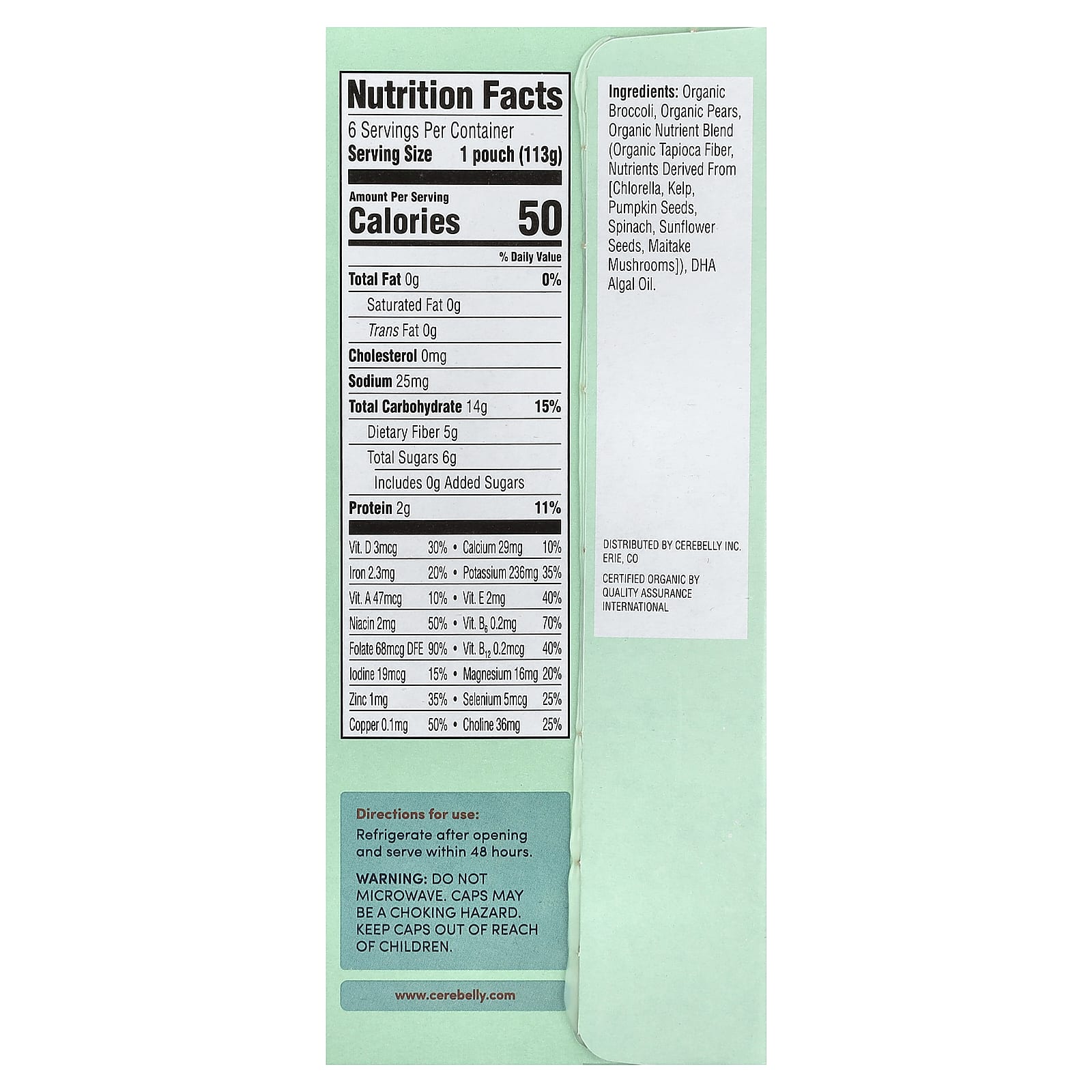 Brócolis orgânico, peras orgânicas, mistura de nutrientes orgânicos (fibra de tapioca orgânica, nutrientes derivados de [chlorella, alga marinha, sementes de abóbora, espinafre, sementes de girassol, cogumelos imatake]), óleo de algas dha.