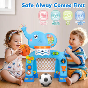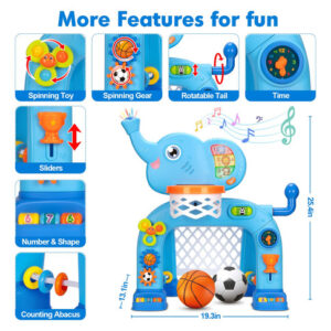 1. Muito interativo com animações e música 2. Conjunto de brinquedos para cesta de basquete e gol de futebol 3. Incentivando luzes e sons intermitentes 4. Tamanho certo para crianças pequenas 5. Presentes de aniversário de Natal fáceis de abrir e instalar para crianças de 1 a 3 anos — Brinquedos interativos para bebês: este brinquedo para menino de 1 ano é super divertido e fácil para a criança engatinhar, andar e correr. Isso os ajuda a desenvolver movimentos e grandes habilidades motoras. Existem dois modos esportivos: uma cesta de basquete e um gol de futebol. O brinquedo eletrônico acenderá com cores intermitentes e emitirá sons quando a bola passar pelo aro. Perfeito para deixar o bebê animado para brincar! Basta pressionar o botão de som para iniciar algumas músicas e luzes que aumentarão a curiosidade das crianças. – Mais um recurso divertido: nosso brinquedo infantil com luzes coloridas, botões de jogo, engrenagens giratórias, controle deslizante de troféus, cauda giratória, rotação do relógio e aprendizado do tempo. Isso ajudará os bebês a desenvolver habilidades motoras finas por meio de uma série de movimentos, incluindo pressionar, girar e agarrar. Gire as engrenagens ou pressione os botões de forma para introduzir formas, números e sons divertidos. Incentive os pequenos a ouvir, tocar, dar uma olhada e descobrir coisas novas. – Luzes e mais de 30 sons e músicas: este conjunto de brinquedos interativo está repleto de todos os tipos de sons divertidos! há chamadas realistas de animais, números e mais de 30 músicas musicais. Vamos cantar junto com músicas temáticas de elefantes. O bebê pode ouvir os aplausos da música ao marcar um gol. Com luzes piscando na tromba do elefante. O botão de música que acende em cores diferentes e o volume é ajustável. – Presente ideal para meninos: este brinquedo interativo para elefantes vem com uma caixa requintada, tornando-o muito fácil de configurar. Ótimo brinquedo de presente para bebês de 12 a 18 a 36 meses. Presente de aniversário ou Natal perfeito para crianças de 1 a 3 anos. Esses conjuntos de brinquedos de basquete e futebol também ajudam pais e filhos a se unirem enquanto se divertem juntos. Participe de brincadeiras ativas, seja em ambientes fechados ou ao ar livre. Pronto, atire e divirta-se! – Seguro para bebês: este brinquedo de cesta de basquete para elefantes e gol de futebol com luzes é feito de plástico ABS de alta qualidade. Nosso divertido brinquedo musical ajuda os pequenos a desenvolver suas habilidades motoras, e suas bordas lisas garantem que seu filho possa brincar com segurança. As robustas pernas e patas de elefante são projetadas para manter a cesta de basquete estável. Tem designs coloridos e atraentes que definitivamente chamarão a atenção das crianças!