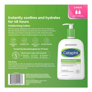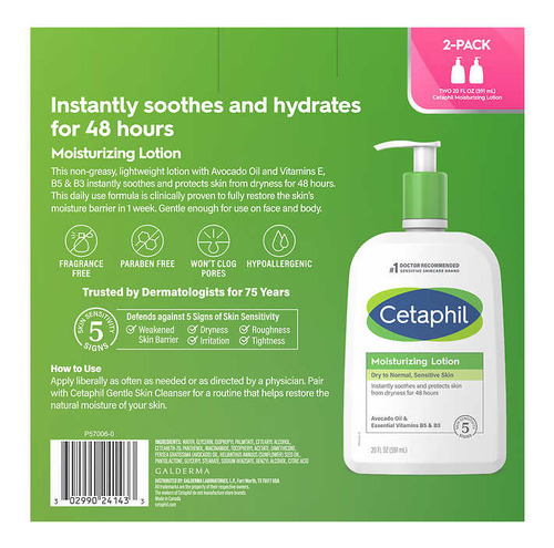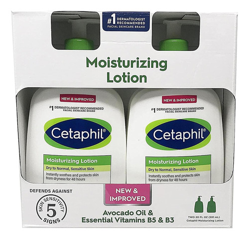 BW5EXP O pacote de loção hidratante Cetaphil contém dois frascos da loção hidratante Cetaphil, cada frasco contendo 591 mL. A Loção Hidratante Cetaphil é uma fórmula leve e não oleosa que fornece hidratação duradoura para peles secas e sensíveis.