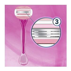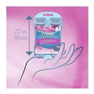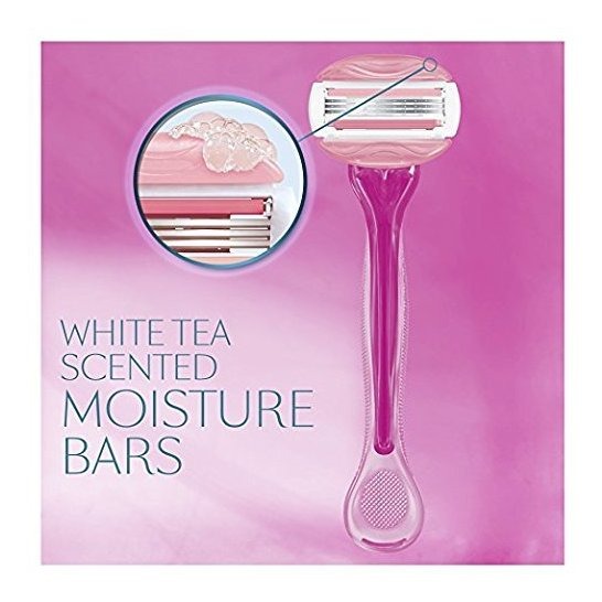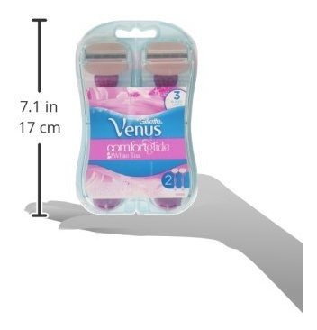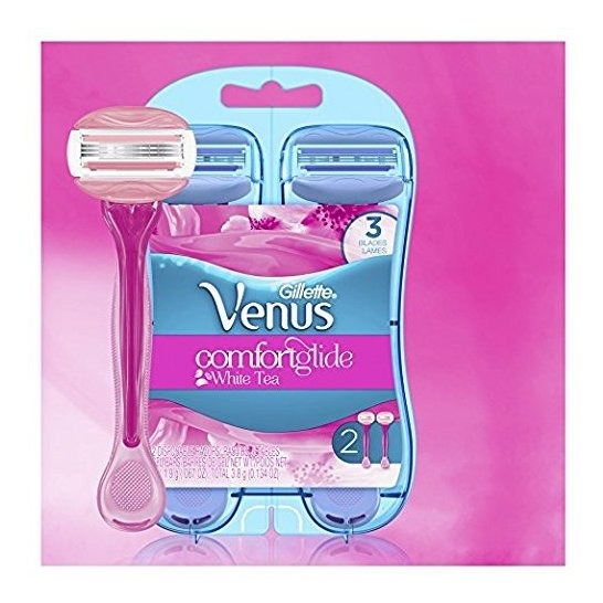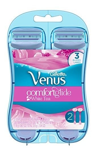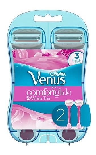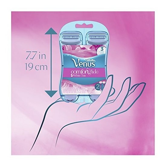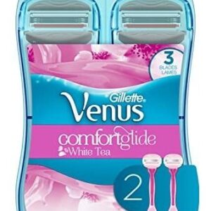 Lâminas de barbear descartáveis Gillette Venus ComfortGlide para mulheres, 2 unidades, barras hidratantes com aroma de chá branco para um barbear suave – Barras de gel de barbear embutidas com manteiga corporal rica e um aroma de chá branco fresco eliminam a necessidade de gel ou sabonete adicional. – 3 lâminas de barbear para um barbear bem apertado. – Alça bem torneada para controle. – Não é necessário trocar a lâmina de barbear – Inclui uma tampa de viagem conveniente – Instruções: Misture quando as barras de gel de barbear se desgastarem ou as lâminas ficarem opacas. Para obter melhores resultados, armazene e afaste-o do fluxo de água entre os usos.