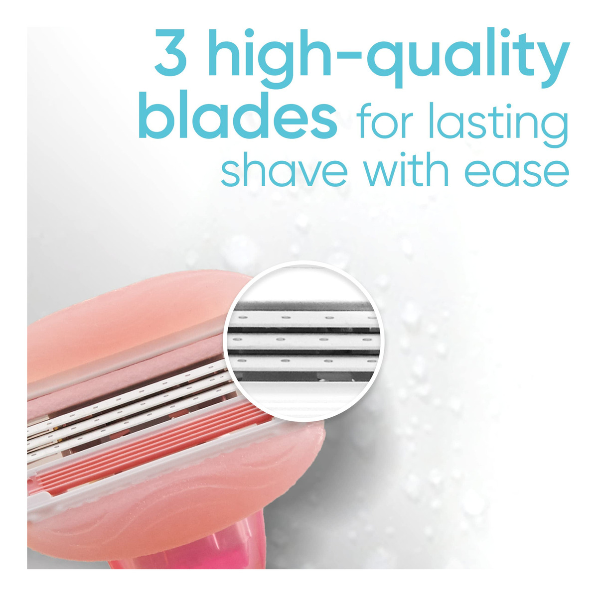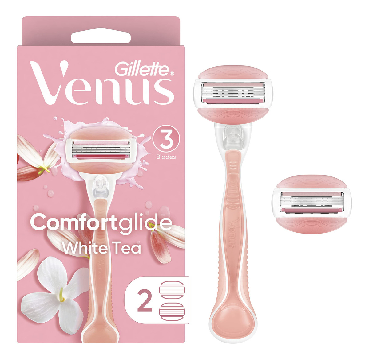 Máquina de barbear feminina Gillette Venus ComfortGlide White Tea — 1 alça e 2 recargas — As recargas servem para todas as alças da máquina de barbear Venus — 3 lâminas para um barbear suave — Sabonetes flexíveis com aroma de chá branco — Cabeça giratória e arredondada abraça curvas e cabe facilmente em áreas difíceis de barbear — Não é necessário usar creme de barbear separado
