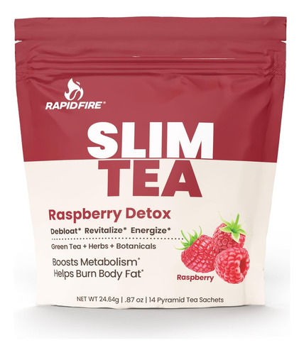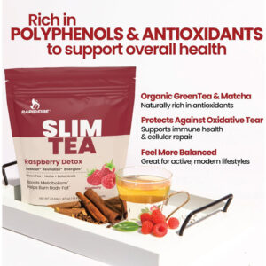 Rapid Fire Slim Tea Framboesa com sabor de framboesa A framboesa é uma deliciosa infusão projetada para apoiar seu bem-estar diário com energia limpa e natural. Enriquecido com extrato de chá verde e ervas adaptogênicas, oferece um impulso suave que ajuda você a se manter energizado e concentrado sem nervosismo ou quedas de energia. Esta fórmula cuidadosamente elaborada inclui rooibos orgânicos, rosa mosqueta e raiz de gengibre para apoiar a digestão saudável e o conforto intestinal, tornando-a ideal para consumo após as refeições. Rico em polifenóis e antioxidantes de ingredientes premium, como matcha e chá verde orgânico, ele ajuda a proteger seu corpo do estresse oxidativo diário. Seu sabor refrescante de manga tropical com notas de framboesa faz deste chá uma alternativa deliciosa e satisfatória às bebidas açucaradas.